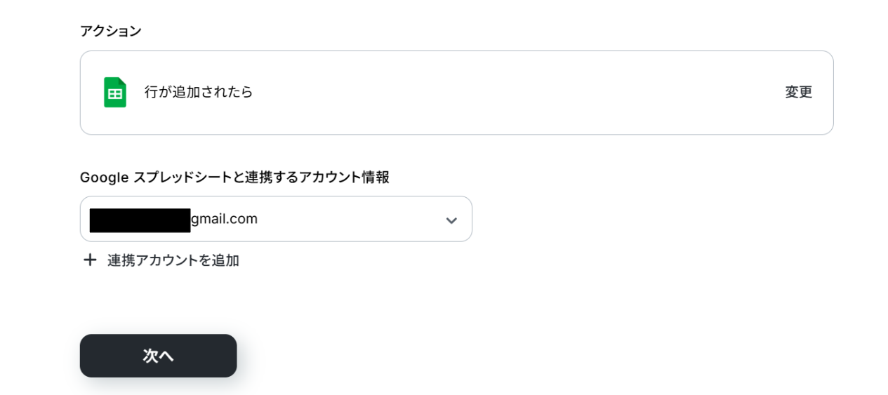 (2)Google スプレッドシートと連携するアカウント情報に誤りがないかを確認し、アクションは「行が追加されたら」のままで「次へ」をクリックしましょう。