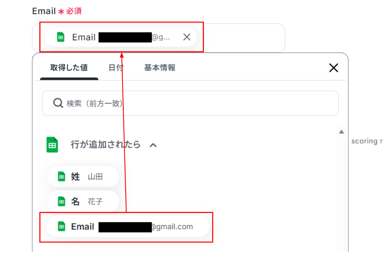 (3)メールアドレス、姓、名など必要な項目に直接入力または「取得した値」を使って入力します。 入力が終わったら「テスト」をクリックしましょう。