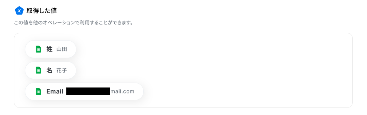 テストに成功すると、取得した値にGoogle スプレッドシートの情報が反映されます。 「取得した値ってなんだろう?」と思った方は下のページをご参照ください。