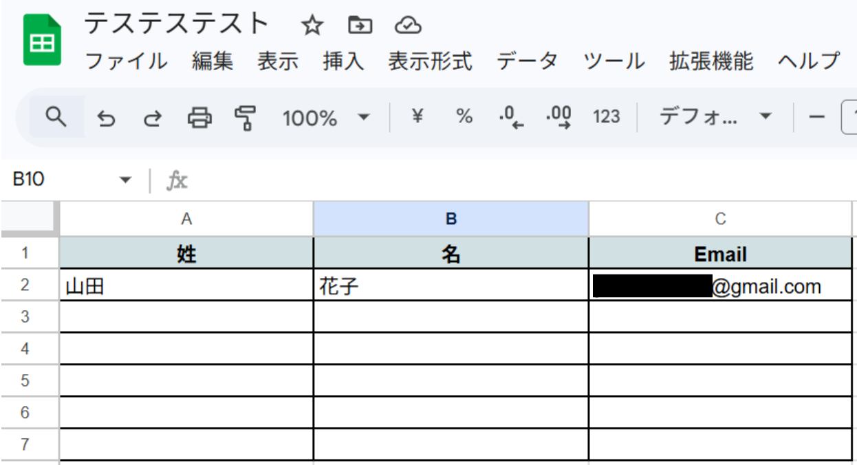 ステップ3:Google スプレッドシートの行が追加された際の設定 Google スプレッドシートと連携してシートに行が追加された際の設定を行います。 Yoomで設定する前にGoogle スプレッドシートにテスト用のデータを作成しておきましょう! 作成が終わったらYoomに戻ります。