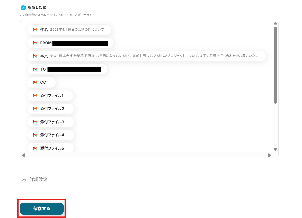 送信後に「テスト」をクリックし、「取得した値」に送信したメールの内容やファイルが抽出されていることを確認しましょう。確認後、「保存する」をクリックして設定完了です。