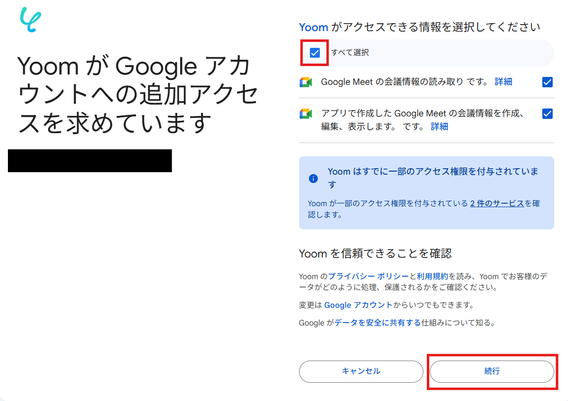 (4)「Yoomがアクセスできる情報を選択してください」の「すべて選択」をチェックし、「続行」をクリックします。