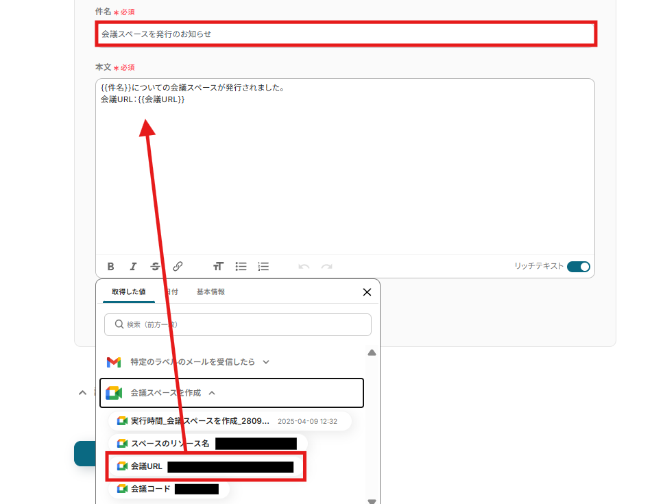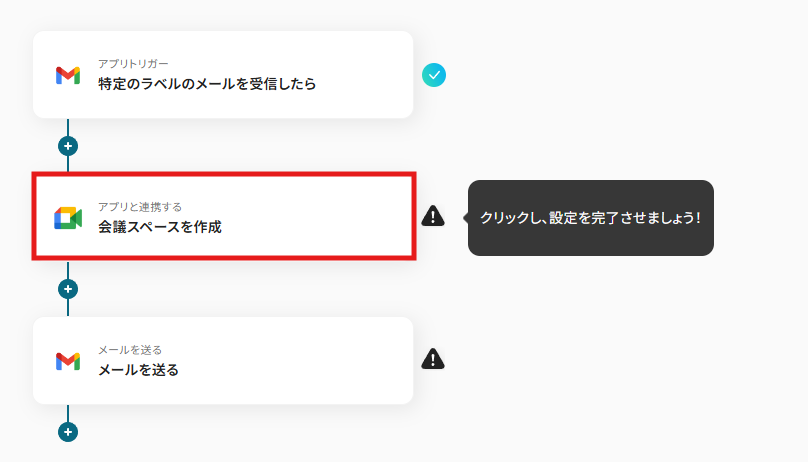Gmailのトリガー設定およびGoogle Meetのアクション設定