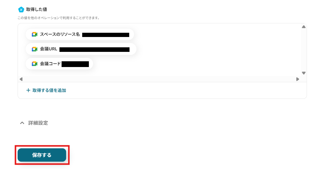 (3)テストを実行し、会議スペースを作成してみましょう。 「取得した値」に作成された会議スペースの内容が表示されているか確認し、「保存する」をクリックします。