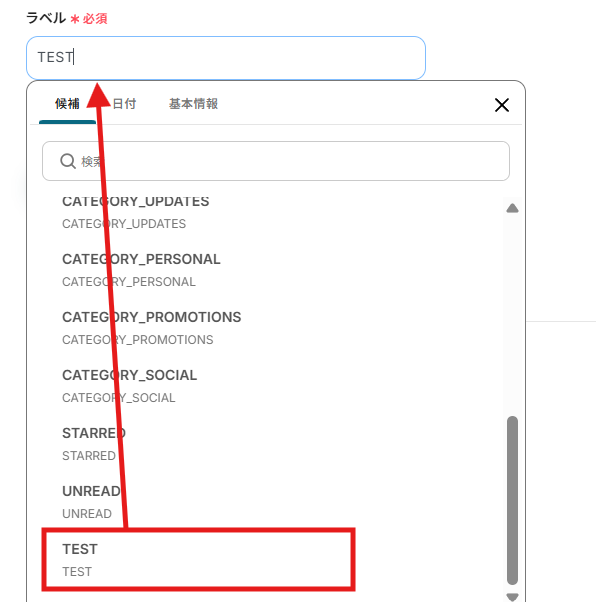 (4)「ラベル」欄に受信したいラベルを設定します。 入力欄をクリックすると、連携しているアカウントから候補が表示されます。フローの運用に使用したいラベルを、「候補」から選択しましょう。