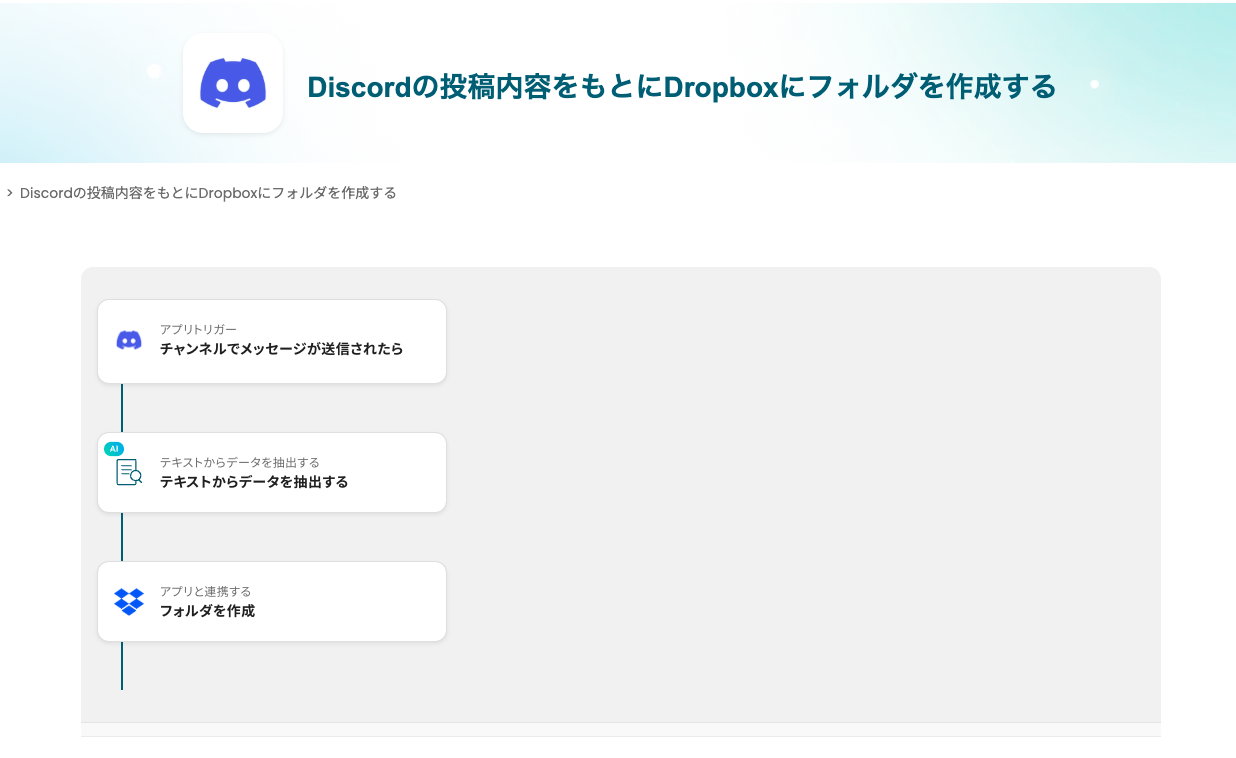 「Discordの投稿内容をもとにDropboxにフォルダを作成する」ワークフローは、Discordでの書き込みをトリガーに自動でDropboxにフォルダを生成し、ファイル管理を効率化する業務ワークフローです。