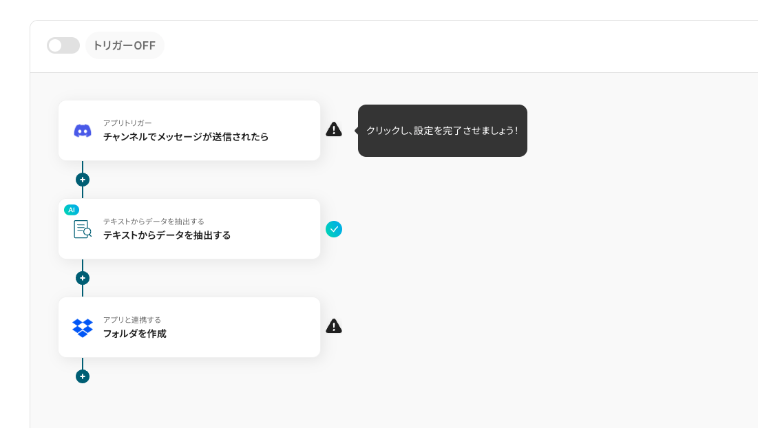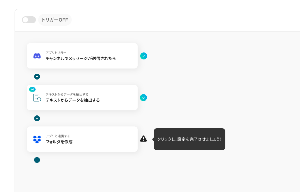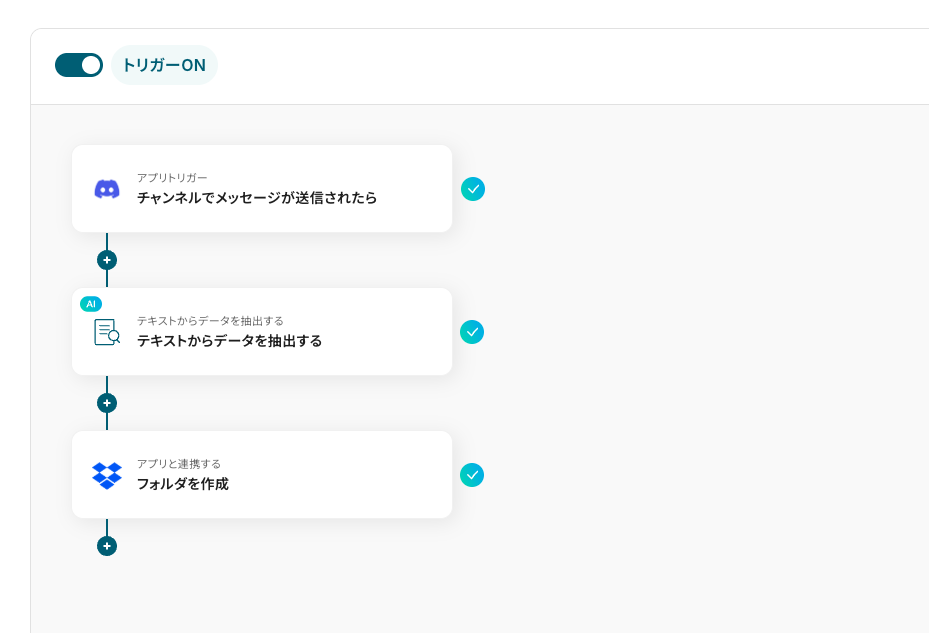 このワークフローを利用することで、Discordの書き込みに応じて自動的にDropboxにフォルダが作成され、情報の整理がスムーズになります。これにより、チームメンバーはファイル管理にかかる時間を削減し、より重要な業務に集中できるようになります。