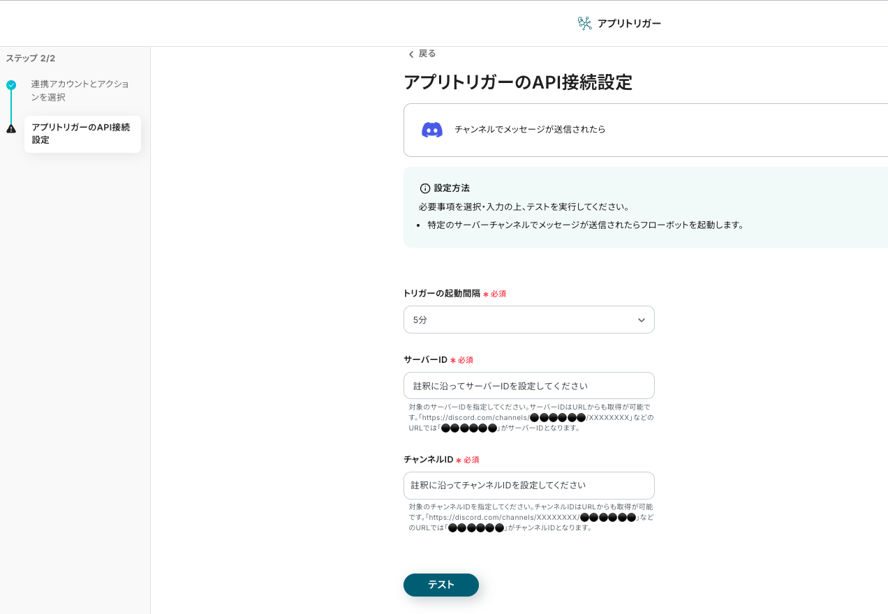 テンプレートの1つ目の工程をクリックし、フローボットのトリガー(起点)を設定します。この工程では、フローボットの起動間隔を設定してDiscordに新しいメッセージが追加されたことを検知するように設定します。