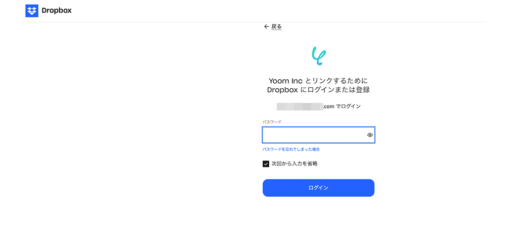連携するDropboxのアカウントを入力して「続行」をクリックすると、パスワードが求められます。