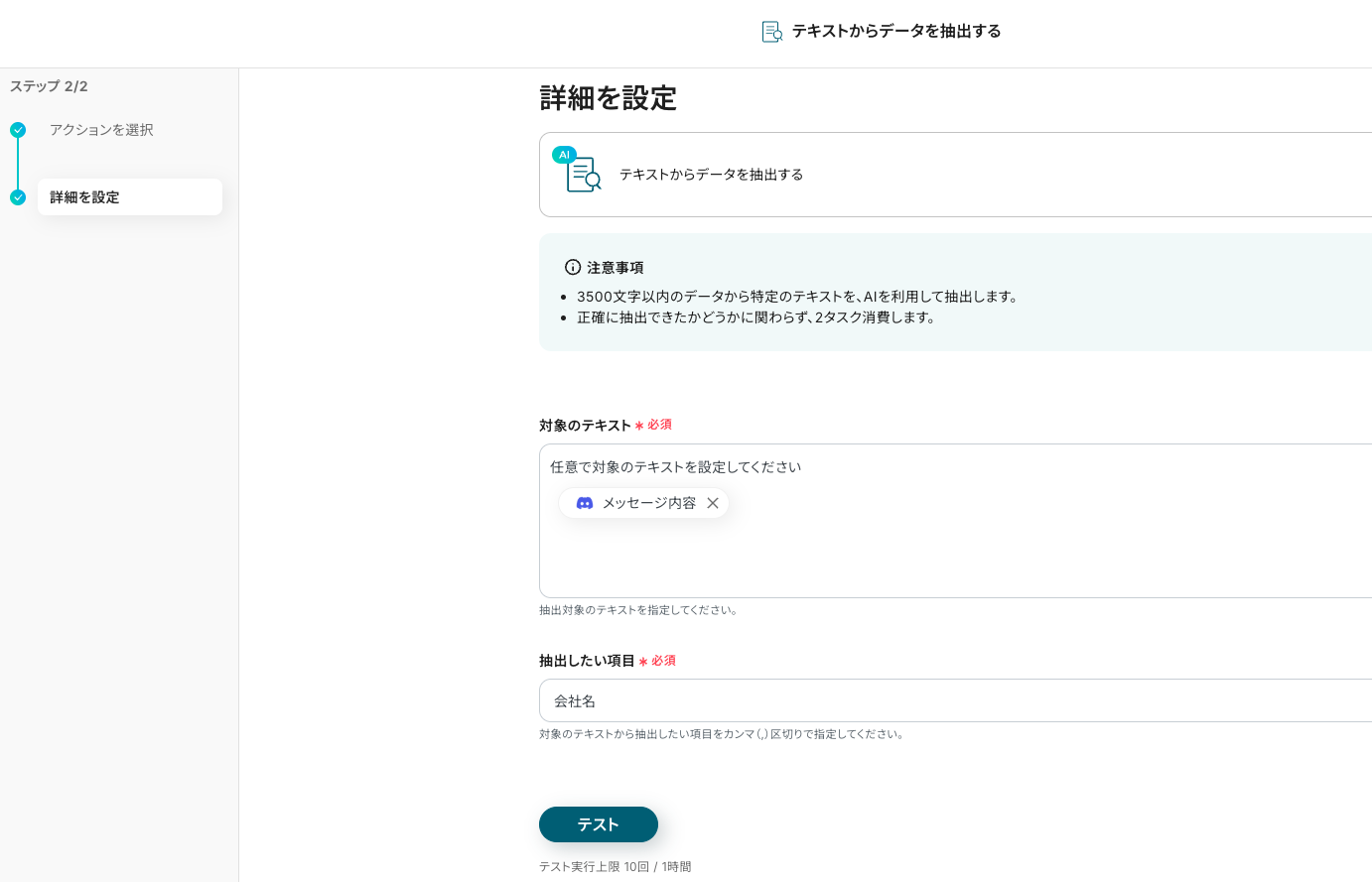設定ができたらテストボタンをクリックします。成功すると、メッセージ内容から該当の項目が抽出されます。