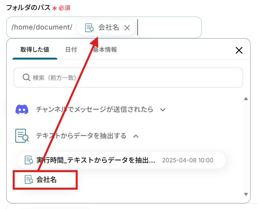 - 今回はフォルダ名に使用したい項目を取得するため「会社名」を設定しました。フォルダ名にしたい項目を設定してください。