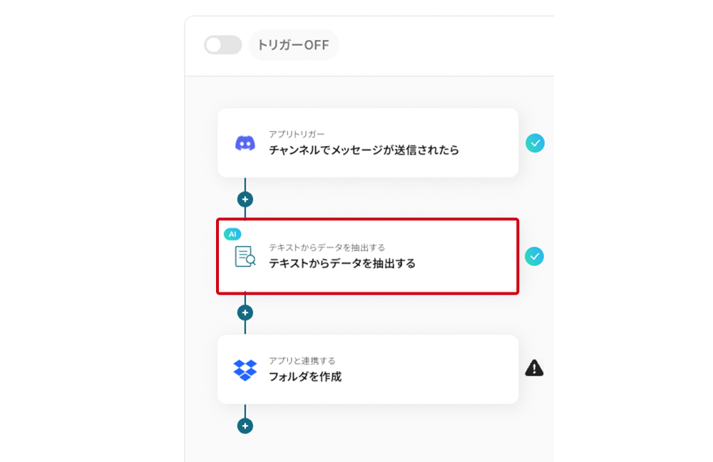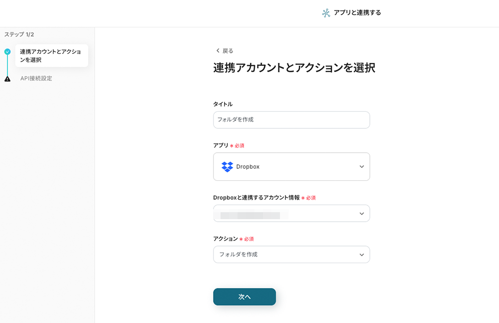 テンプレートの3つ目の工程をクリックします。この工程では、Dropboxの新規フォルダを作成します。前の操作で抽出した語句をフォルダ名に設定します。