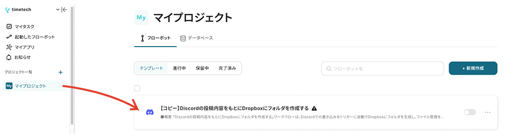 コピーしたテンプレートは、マイプロジェクトに追加されます。マイプロジェクトは左のメニューバーからアクセス可能です。