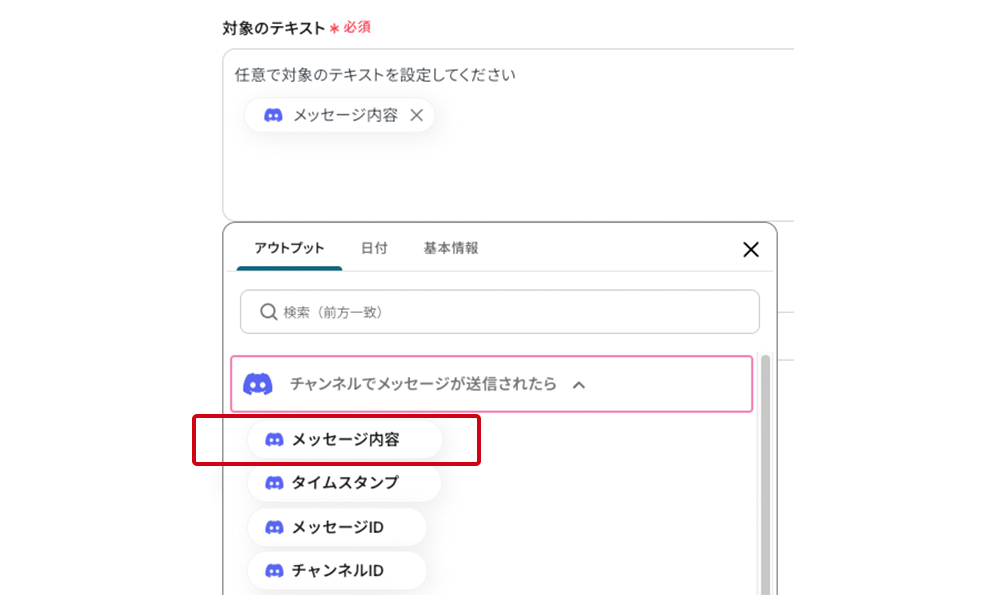 - 事前設定で、Discordから取得したアウトプット{メッセージ内容}}の引用コードが埋め込まれています。この引用コードは編集欄をクリックすると表示されるプルダウンメニュー内にあります。選択すると編集欄に埋め込まれます。