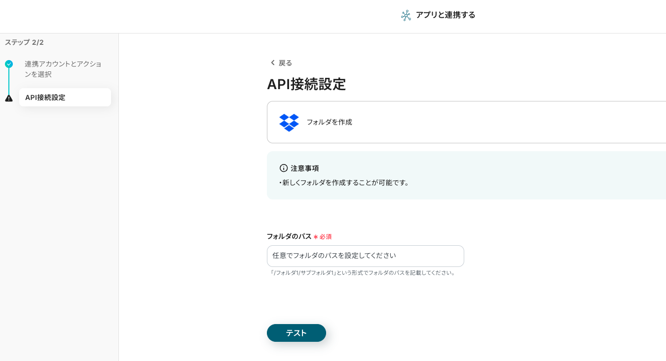 「テスト」をクリックします。 成功すると、Dropboxに新規作成されたフォルダ情報がアウトプットに表示されます。