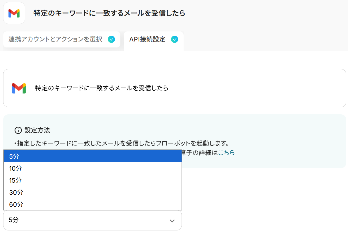 - トリガーは5分、10分、15分、30分、60分の間隔で起動間隔を選択できます。