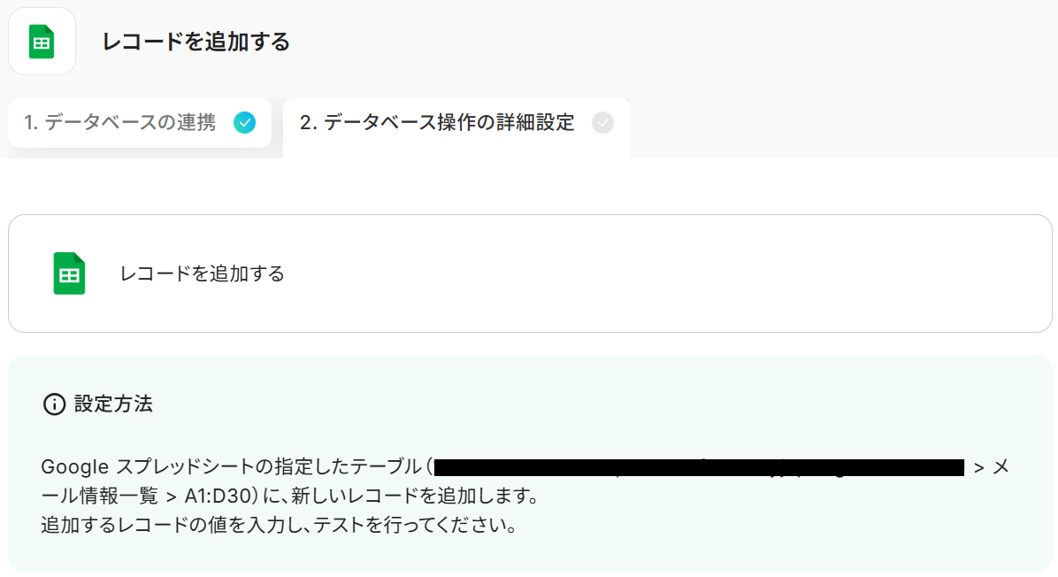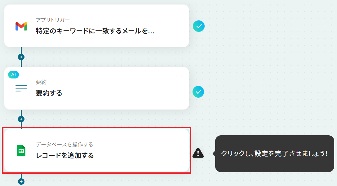 - Google スプレッドシートへの追加先シートは任意で設定でき、追加するレコードには固定のテキストや、トリガーで取得したメール情報、AIの要約結果などを組み合わせて入力することが可能です。