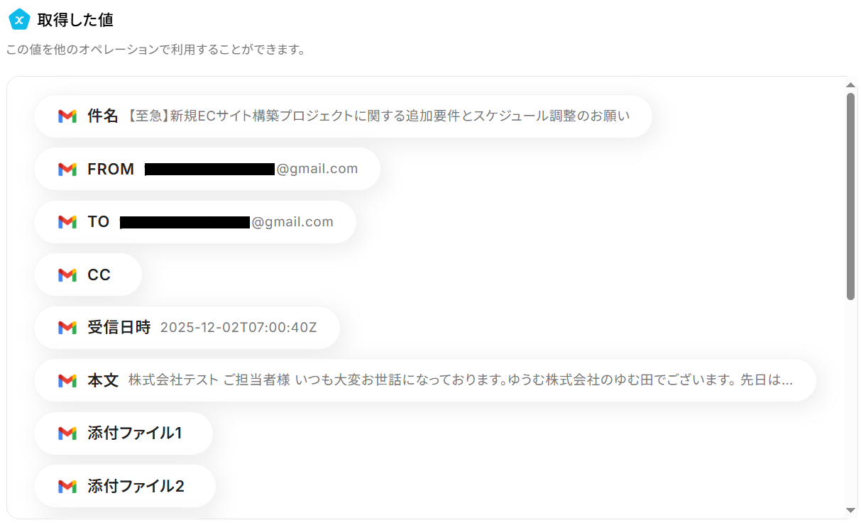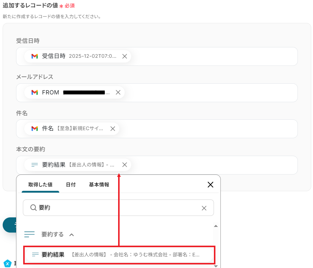 以下のようにGmailの要約機能から取得した値を選択すると、メール情報や要約結果を変数として反映させることができます。