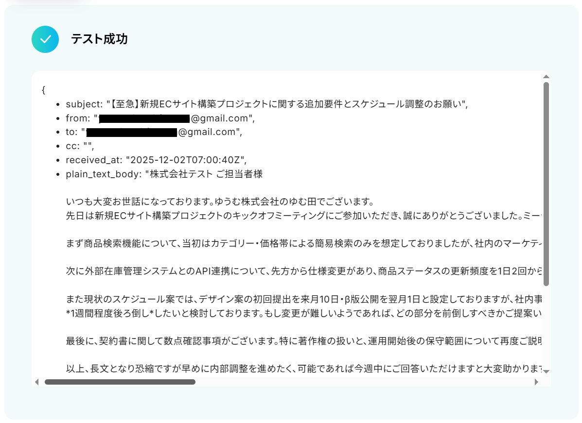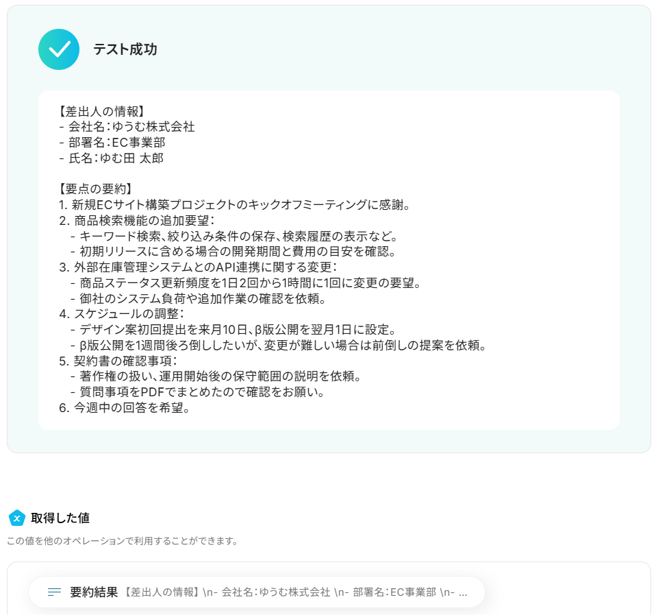 今回は要約だけでなく、差出人の会社名・部署名・氏名も抽出するよう指示しました。