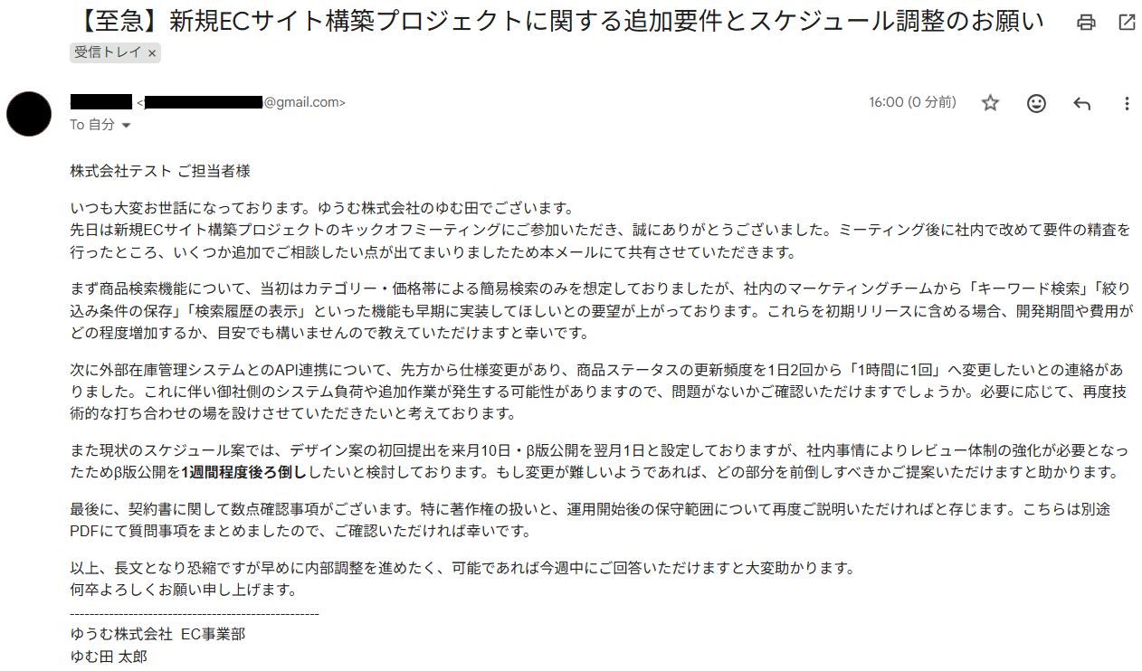 今回は以下のように、件名に「ECサイト」というワードが入った長文メールを送信しました。