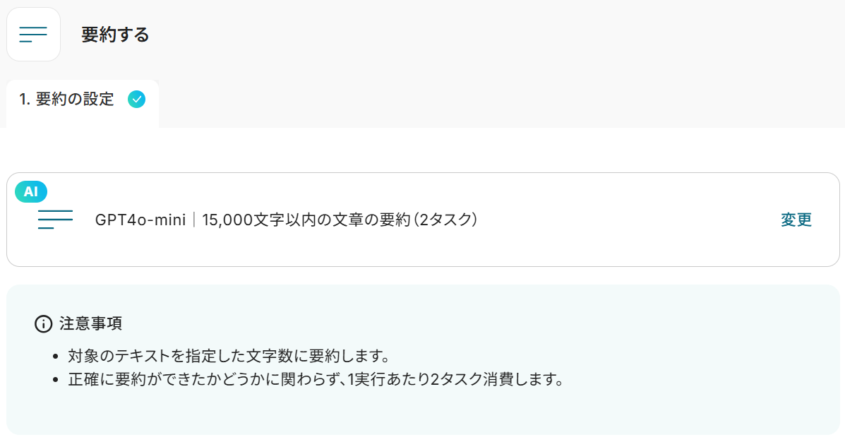 - AI機能の要約オペレーションでは、要約の文字数や抽出したい項目(例:要点、ネクストアクションなど)を任意でカスタム設定できます。