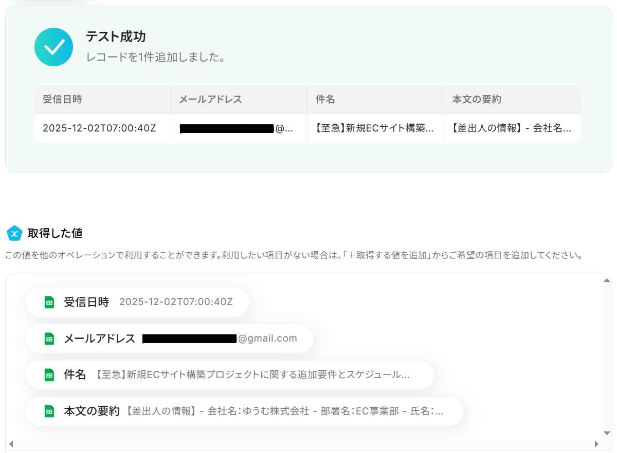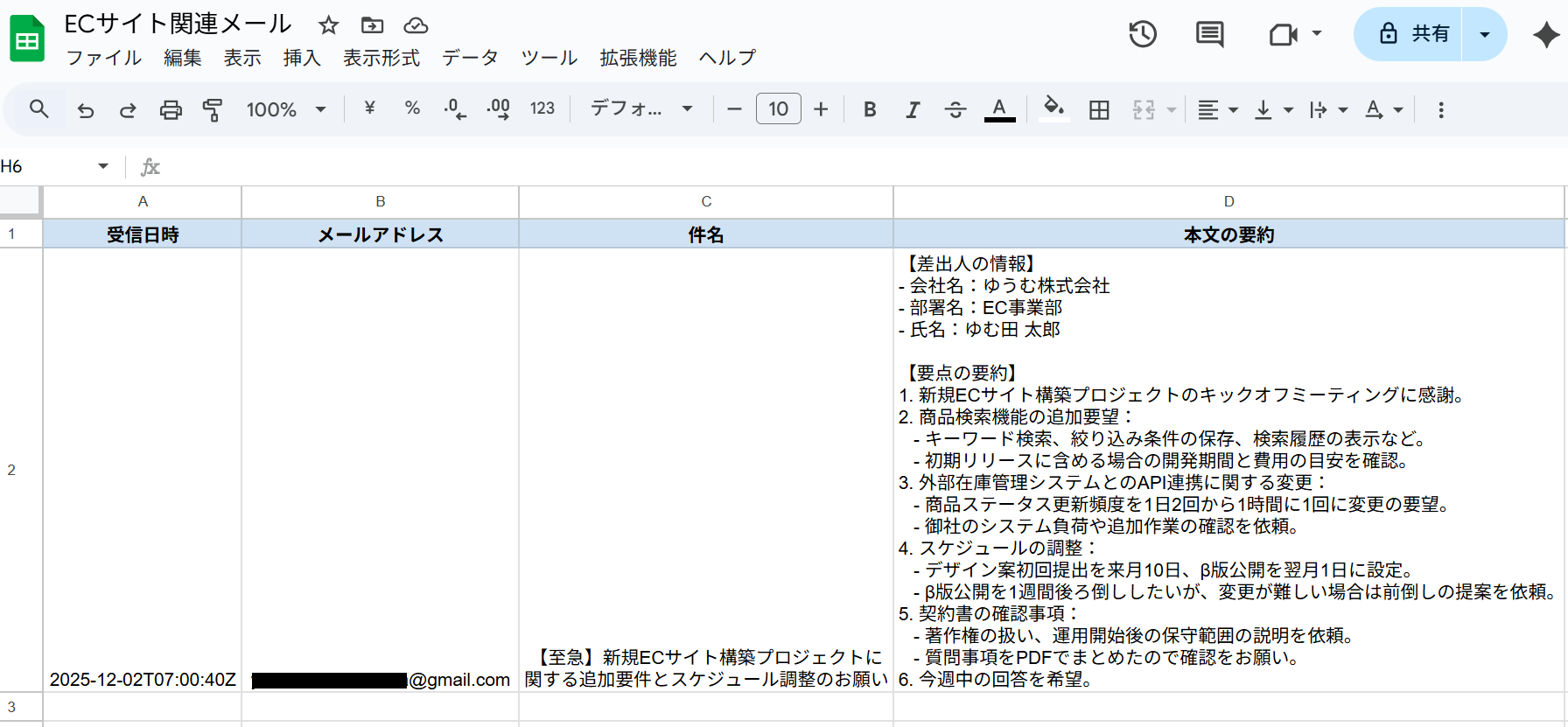 用意したシートにメール情報と要約結果が自動で追記されました!