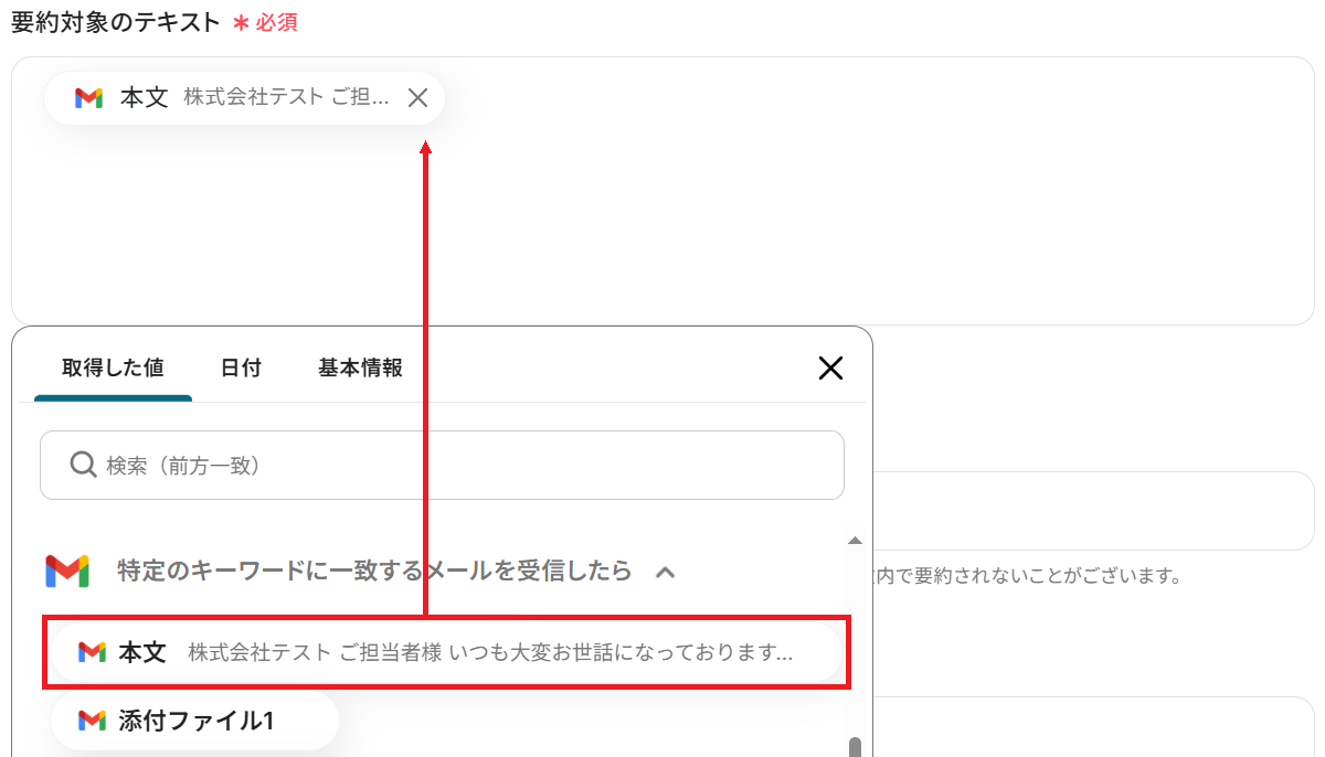 要約対象のテキストには、Gmailから取得した「本文」の値が予め設定されているのでそのままで大丈夫です。