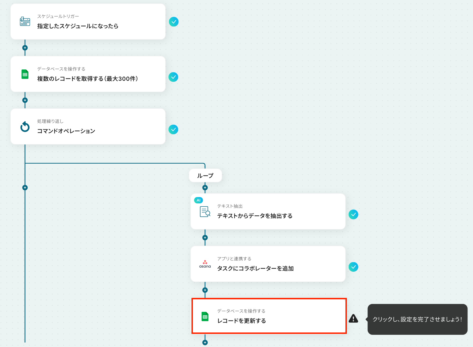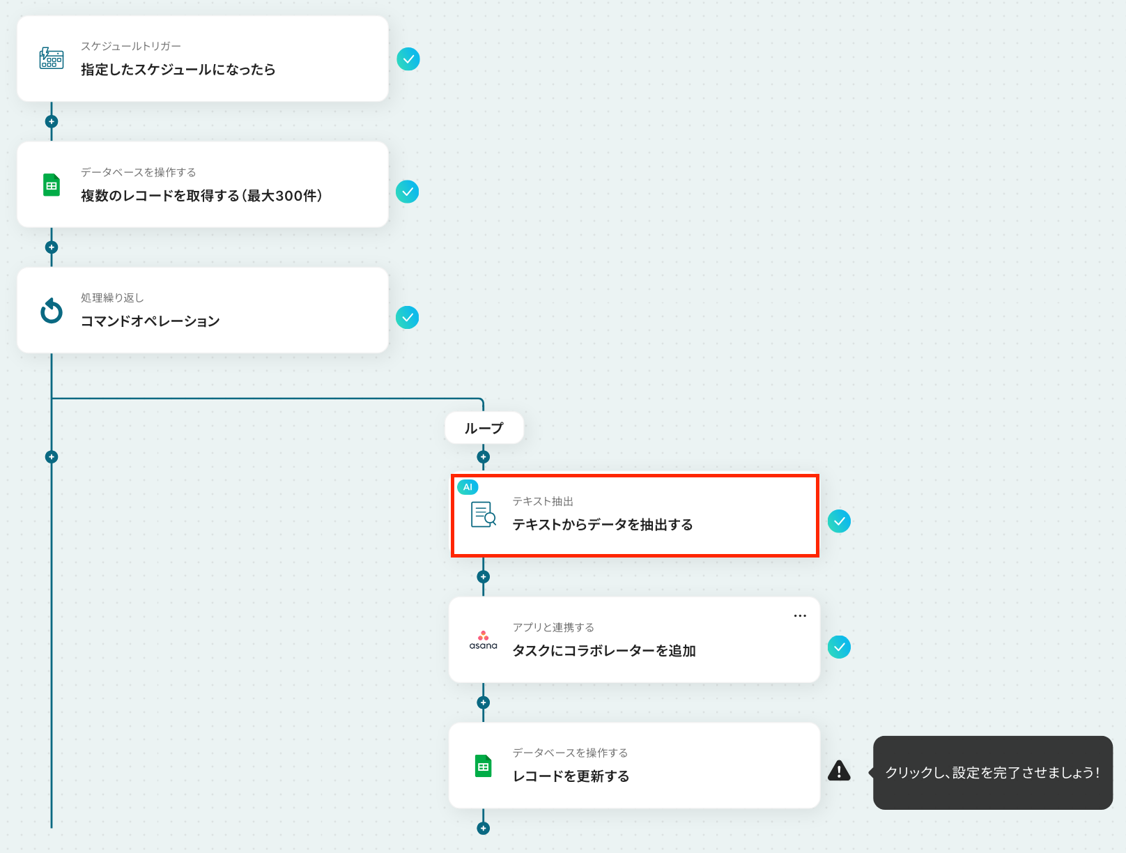 - スケジュールのトリガー設定・Google スプレッドシートの設定・コマンドオペレーションの設定・テキスト抽出の設定・Asanaの設定・Google スプレッドシートの設定