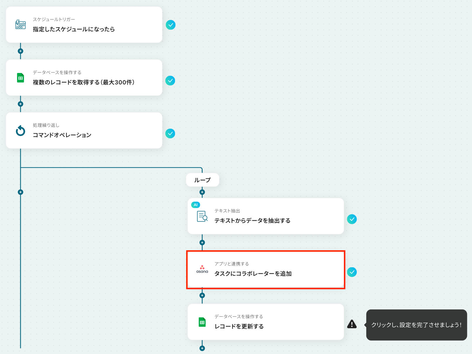 このワークフローを活用すれば、Google スプレッドシートのリストに基づき、指定した日時にAsanaのタスクへコラボレーターを一括で追加する作業を自動化できます。