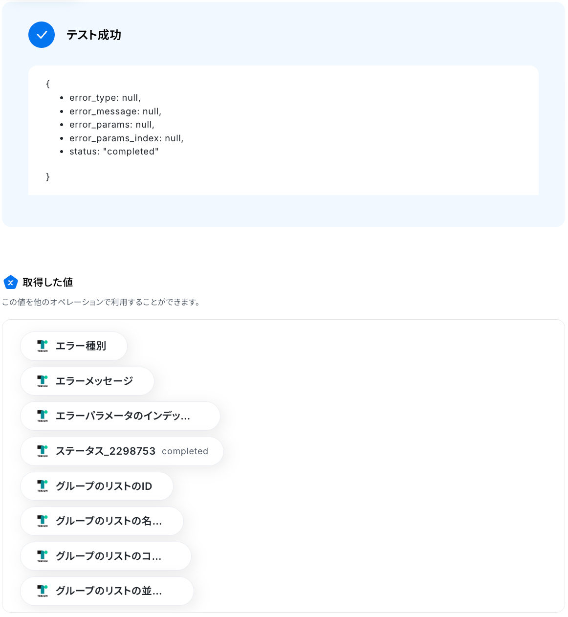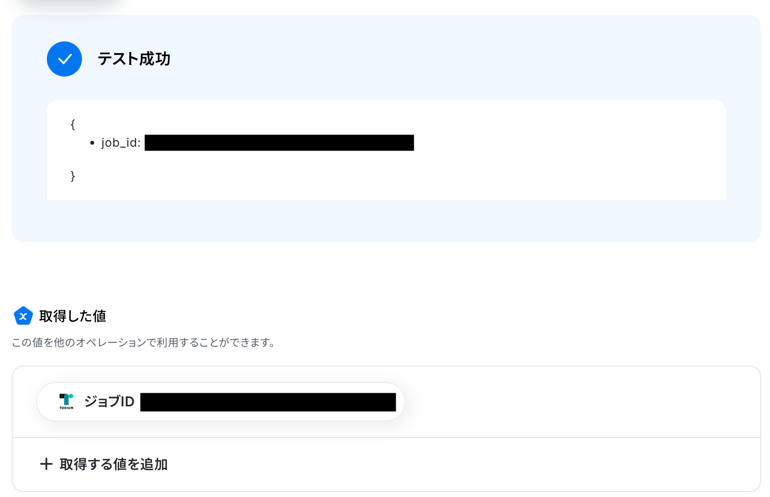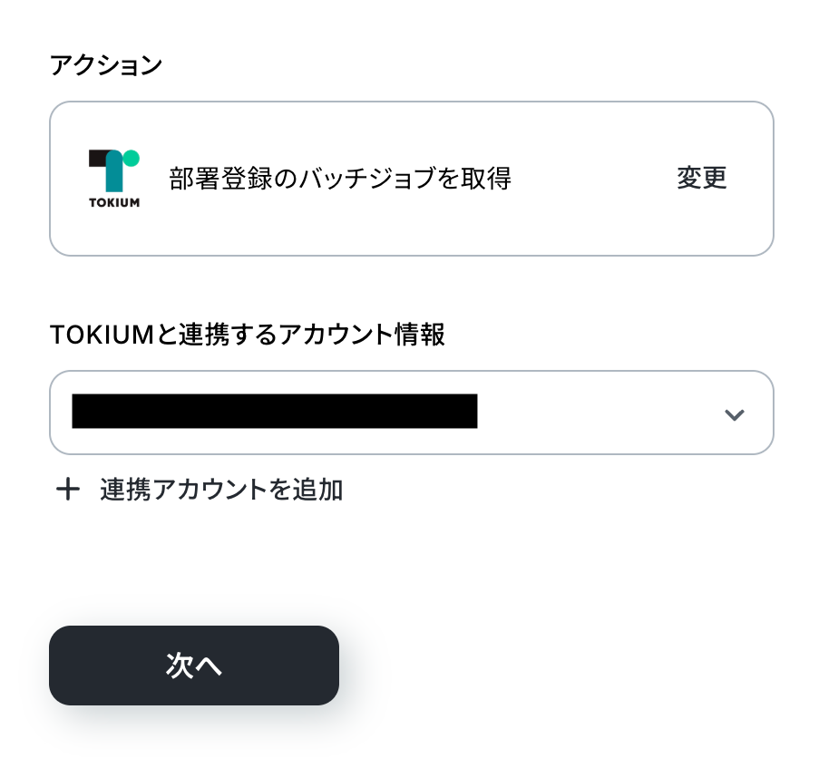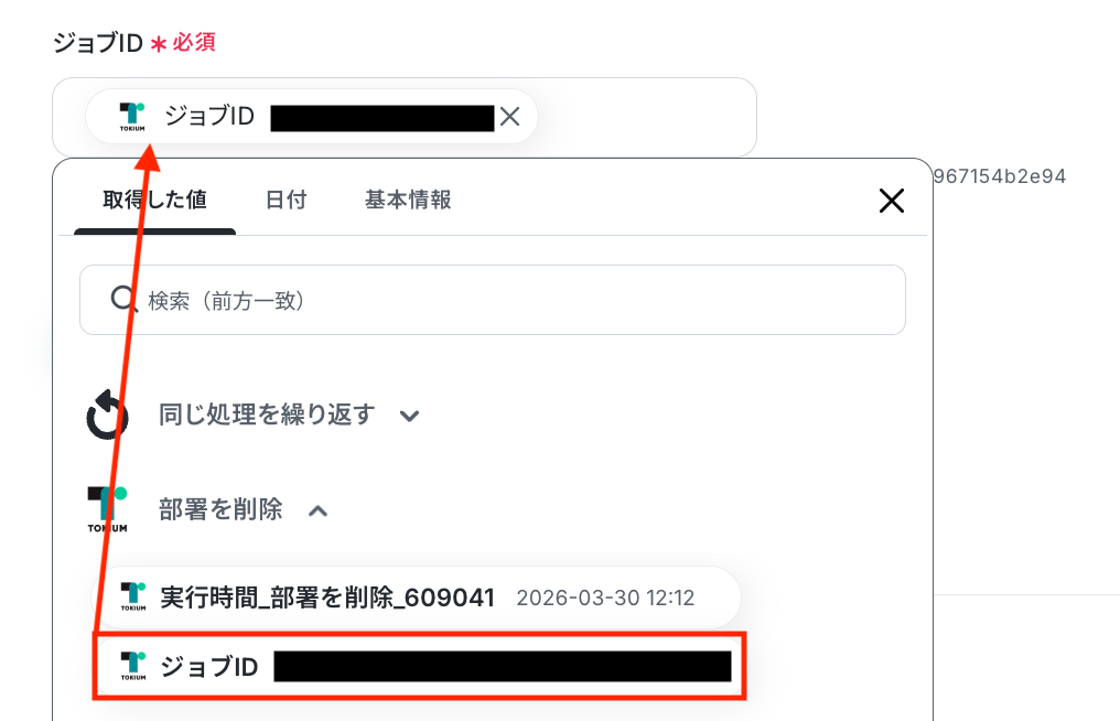 - 続けて、TOKIUMの「部署削除のバッチジョブを取得」アクションで実行結果を取得します。