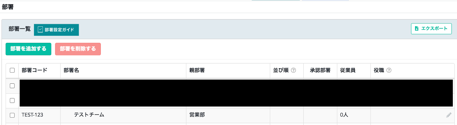 今回はテスト用として、以下の内容で部署を作成しました。