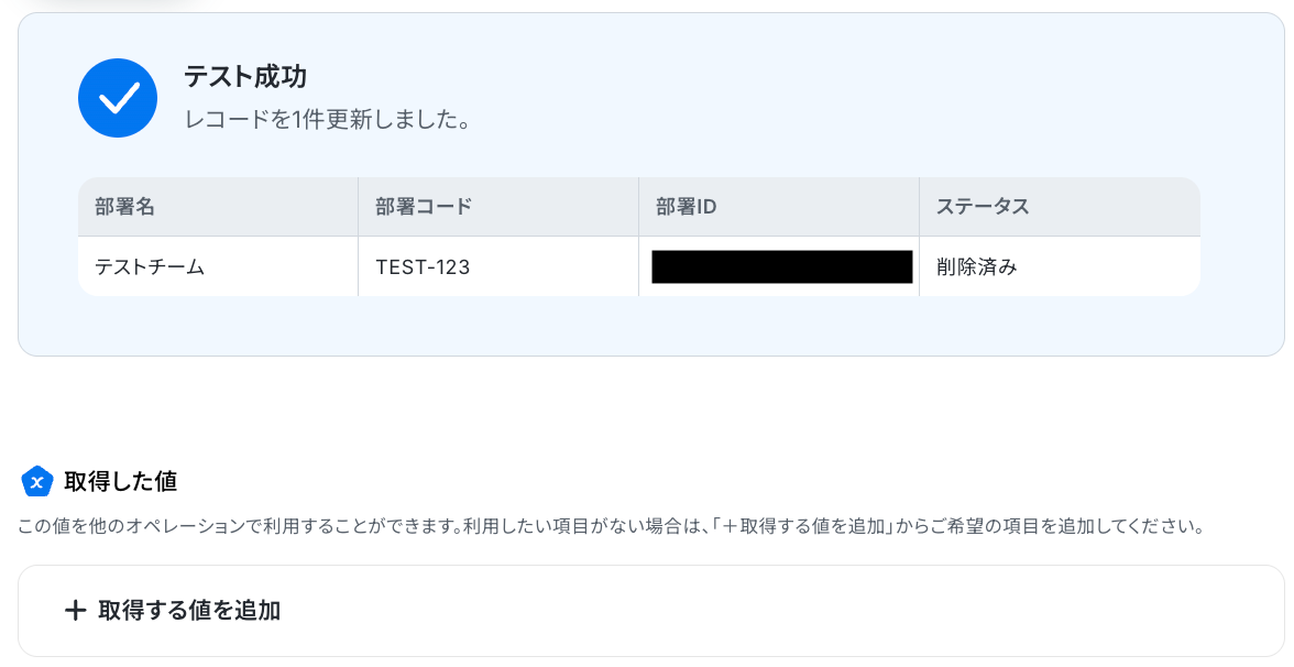 テストに成功すると、検索された部署IDが表示されるので、確認してください。