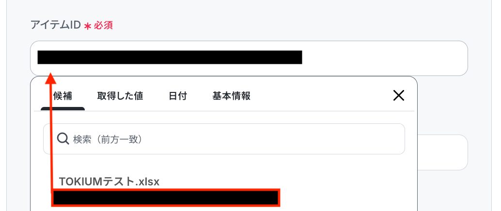 ドライブID、アイテムID、シート名は入力欄をクリックすると候補が表示されるので、それぞれ対象の項目を選択しましょう。