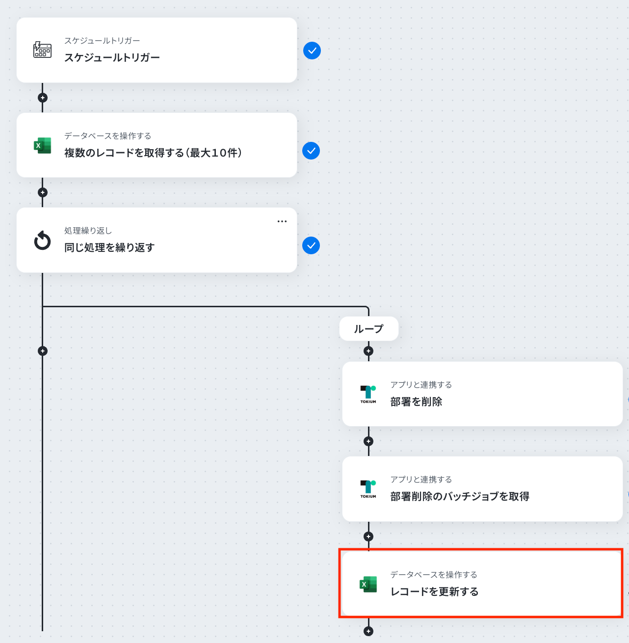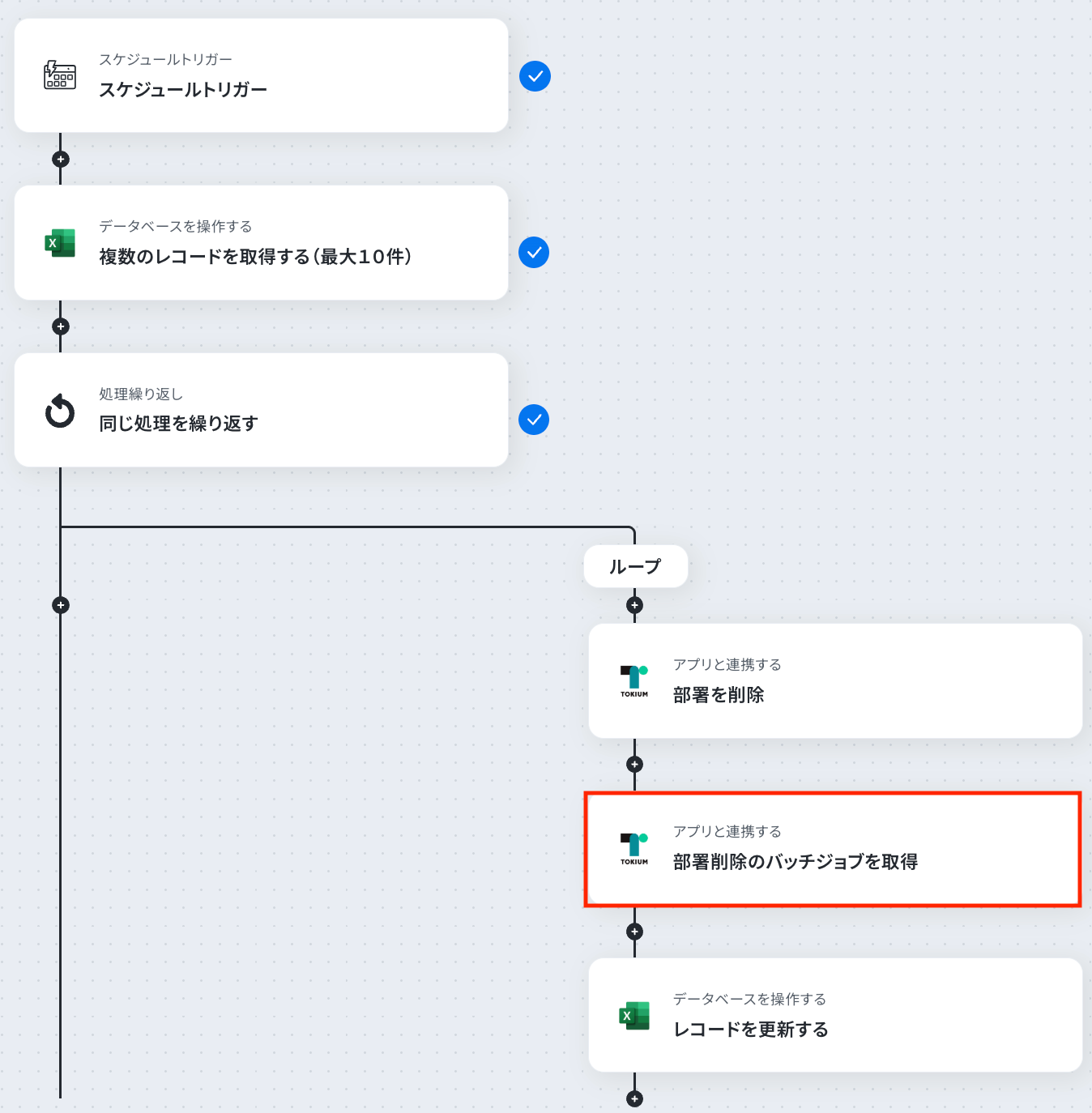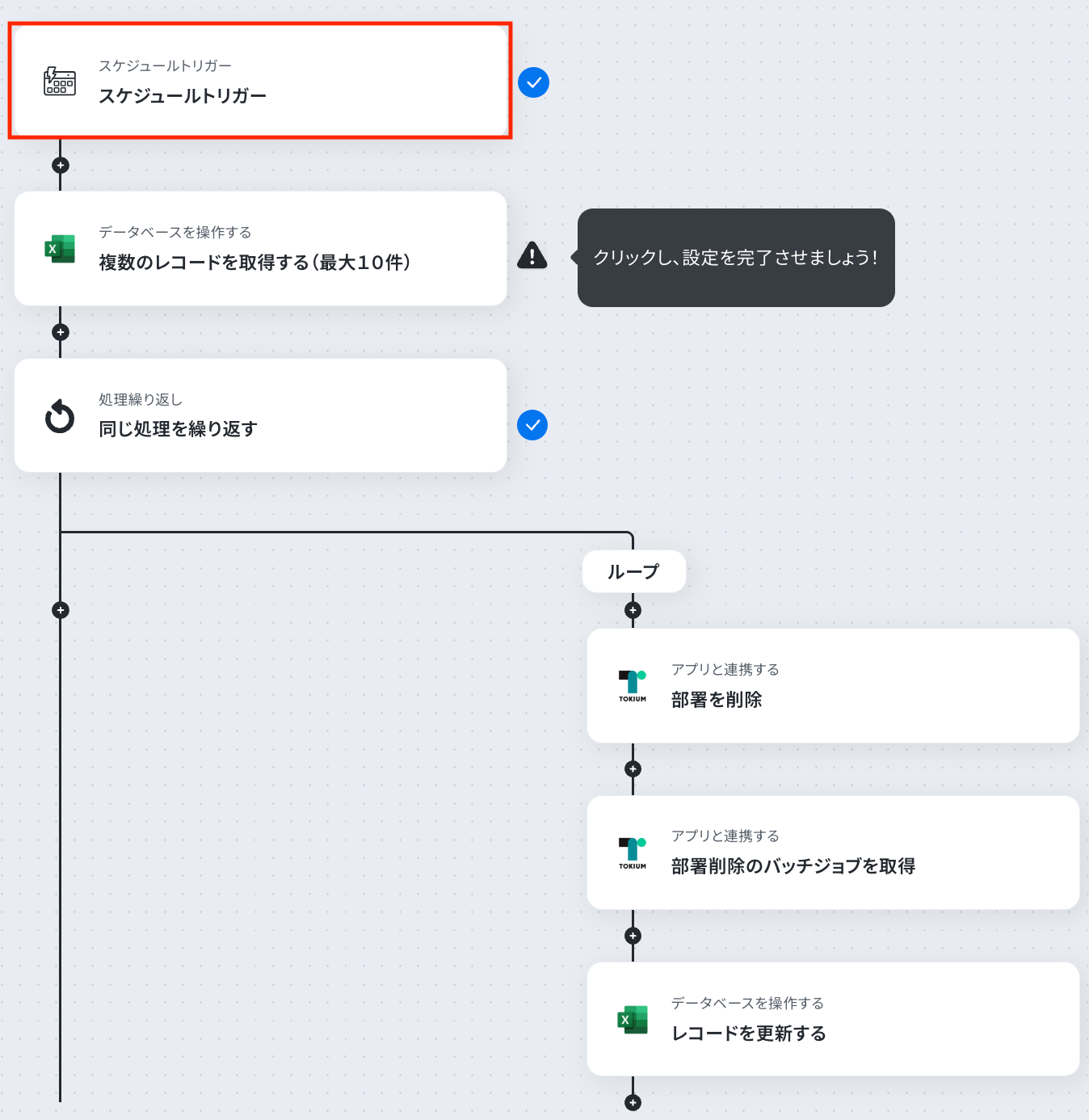 それではここから代表的な例として、「定期的にMicrosoft Excelのリストから情報を取得し、TOKIUMの部署を一括で削除する」フローを解説していきます!