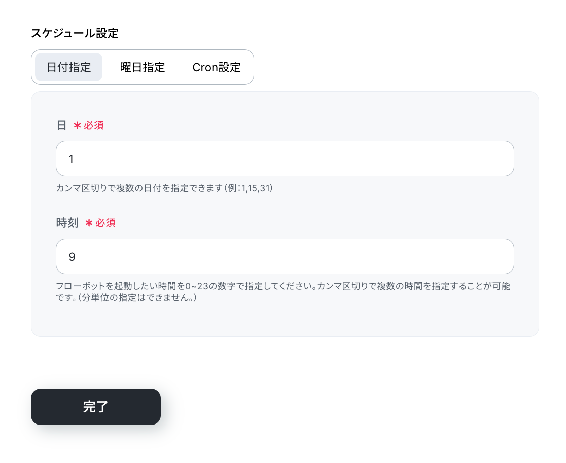 今回は、毎月1日の朝9時にフローボットを実行するよう以下のスケジュールを設定しています。