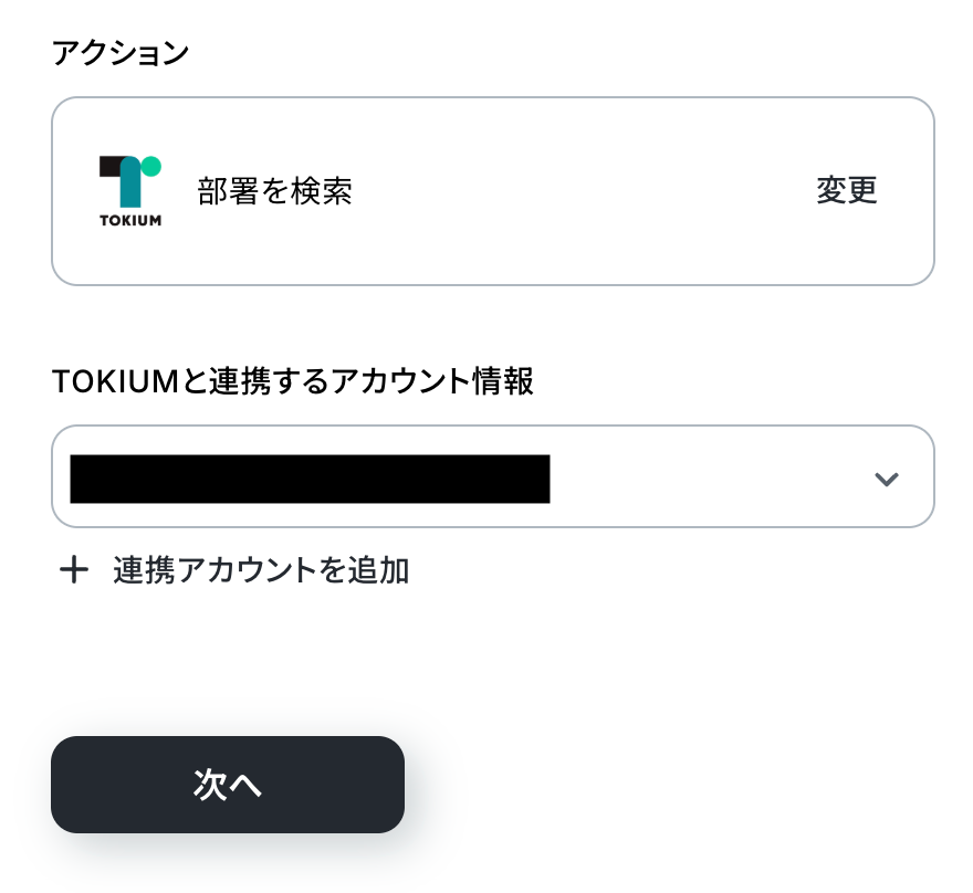 TOKIUMと連携するアカウント情報に問題がなければ、「次へ」をクリックします。