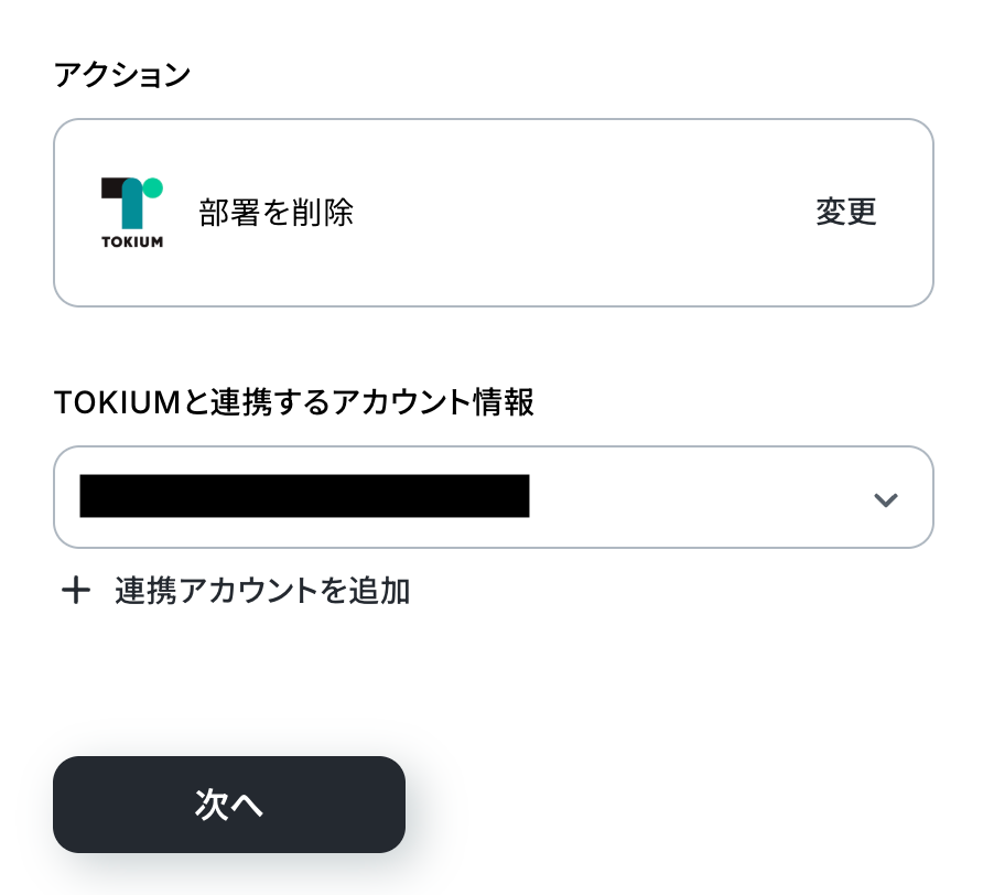 TOKIUMには「部署を登録」「部署を更新」「部署を削除」のアクションが用意されているため、削除だけでなく、部署の追加や更新も自動化できます。