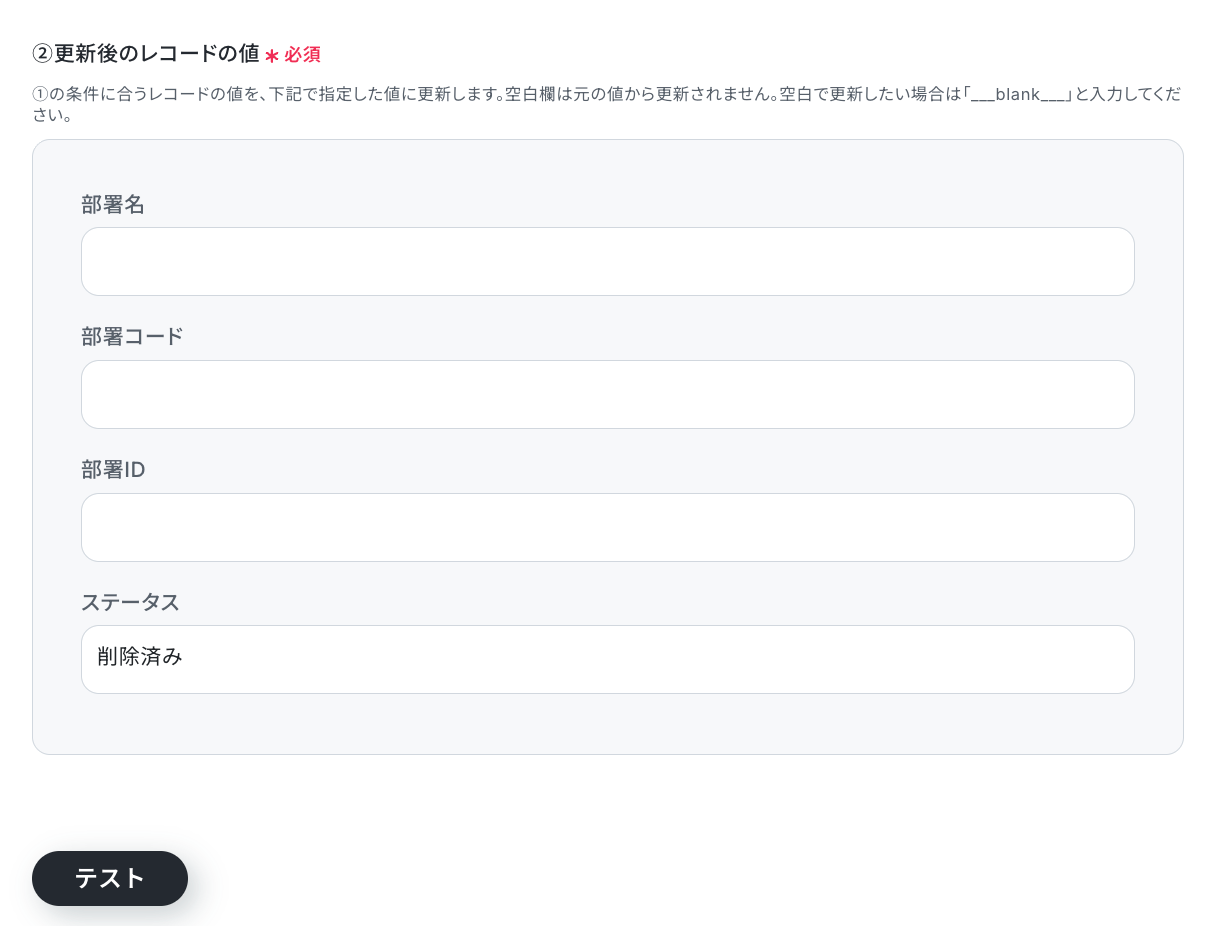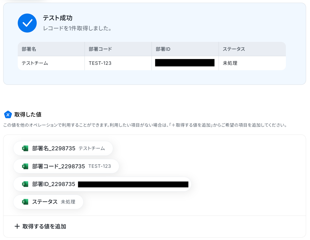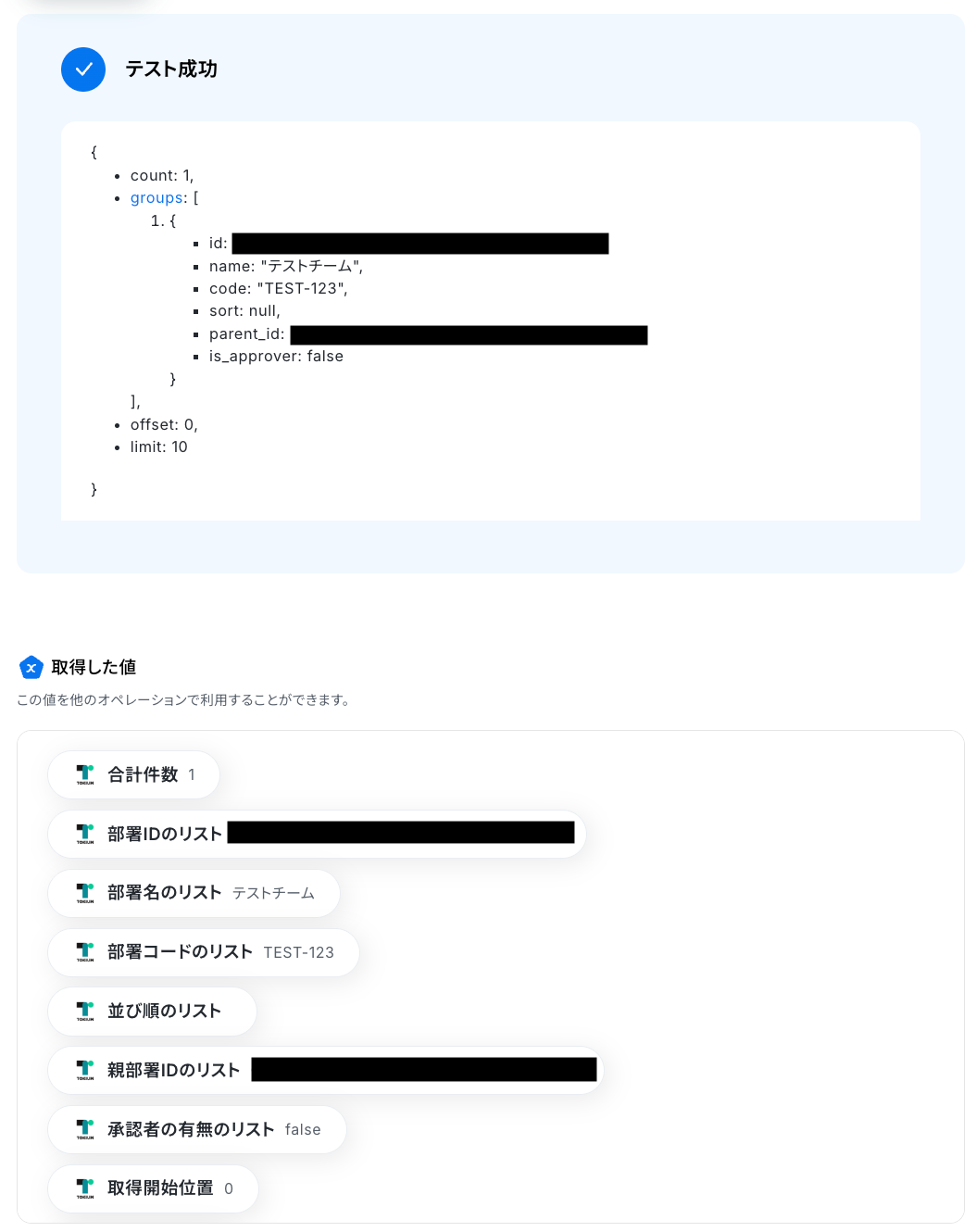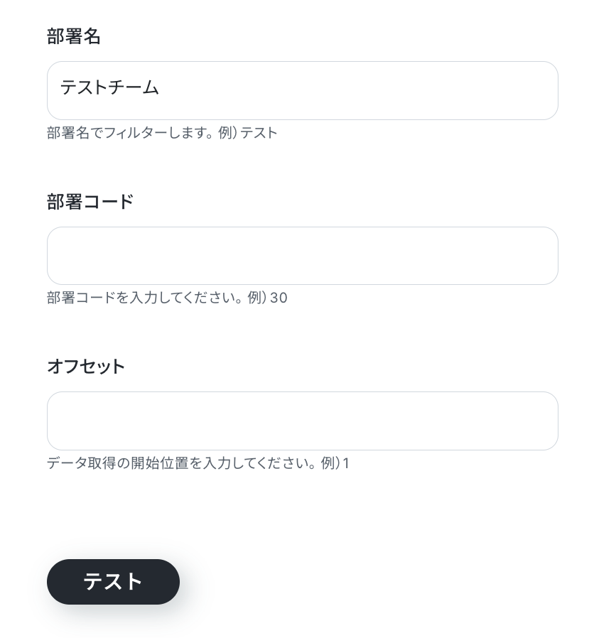 入力が完了したら「テスト」をクリックして、設定した部署名の部署IDが取得できるか確認しましょう。