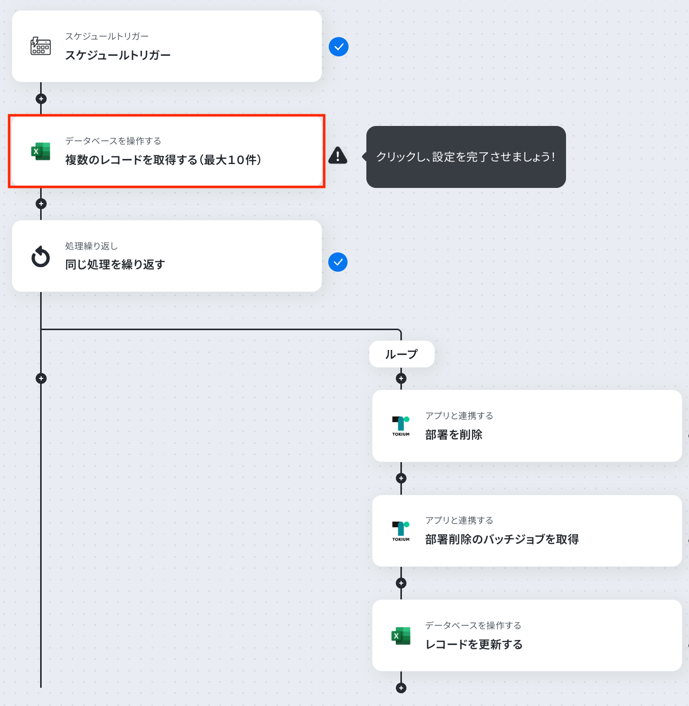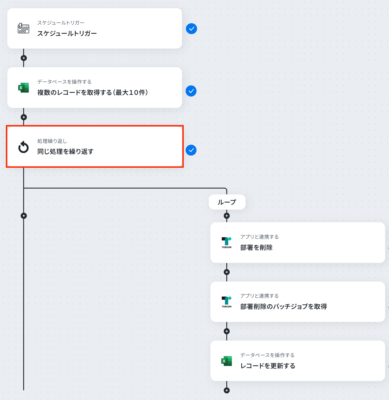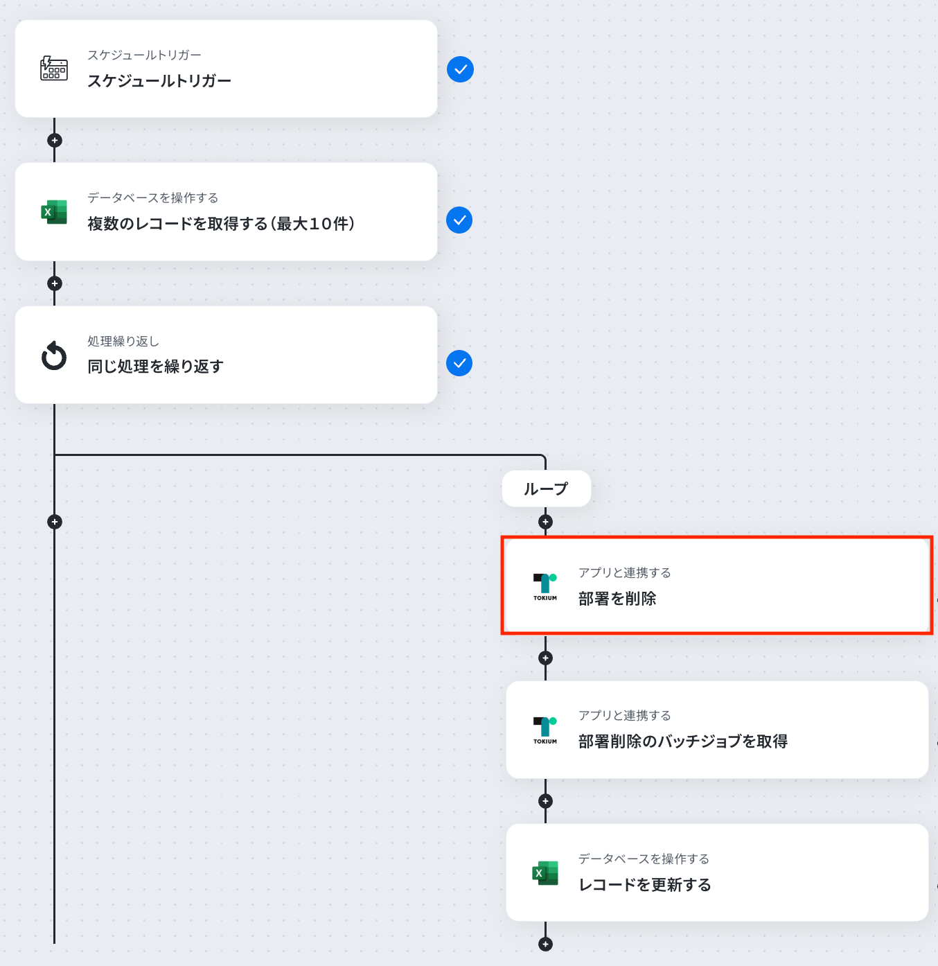 - ループ内で、TOKIUMの「部署を削除」アクションを設定し、部署を削除します。