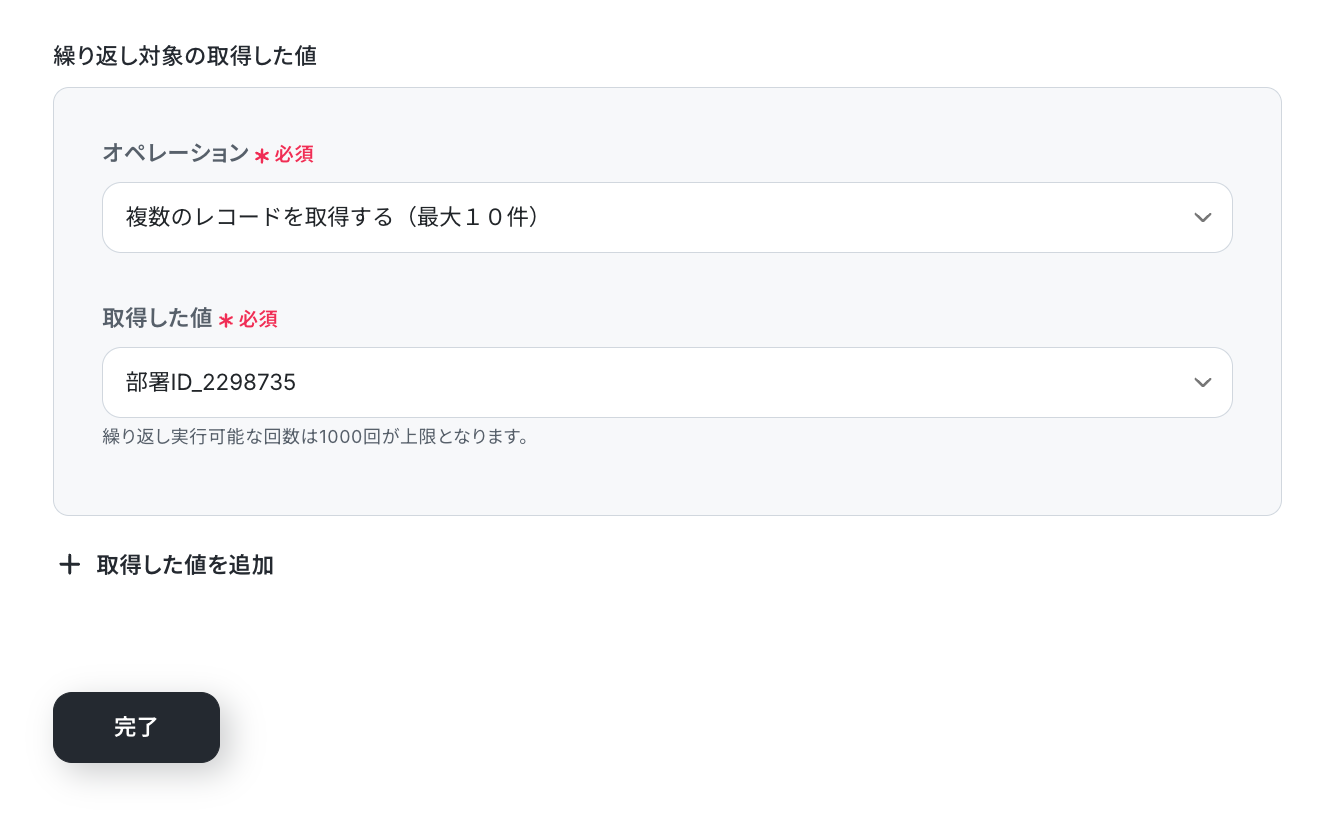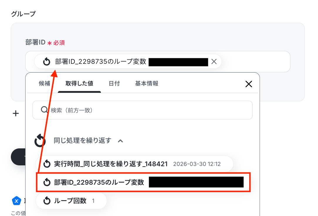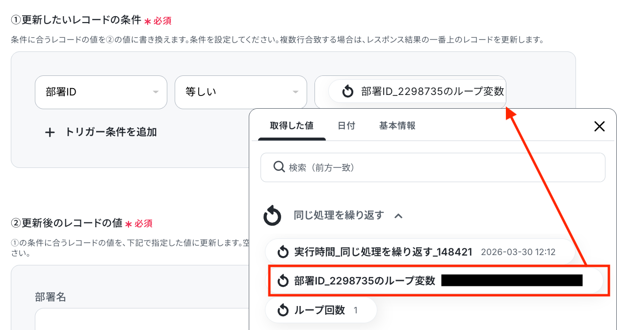 - ループ機能では、前段のMicrosoft Excelで取得したレコードの中から、部署IDなど繰り返し処理を行いたい値を設定してください。