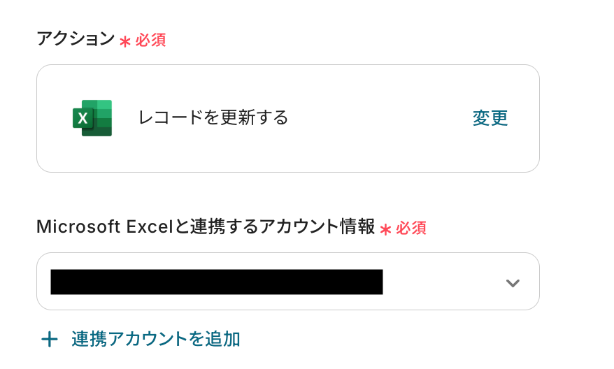 - 最後に、Microsoft Excelの「レコードを更新する」アクションで、取得したバッチジョブの結果を元のファイルに更新します。