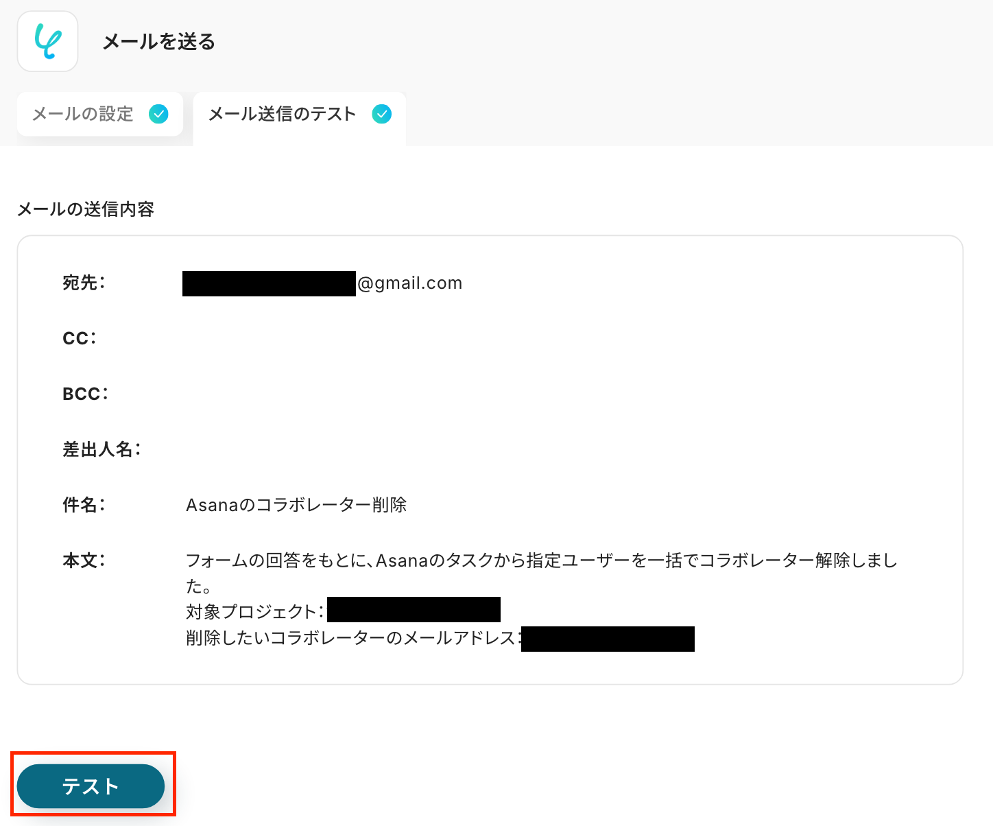 宛先や本文に間違いがないかを確認し、「テスト」をクリックしましょう!
