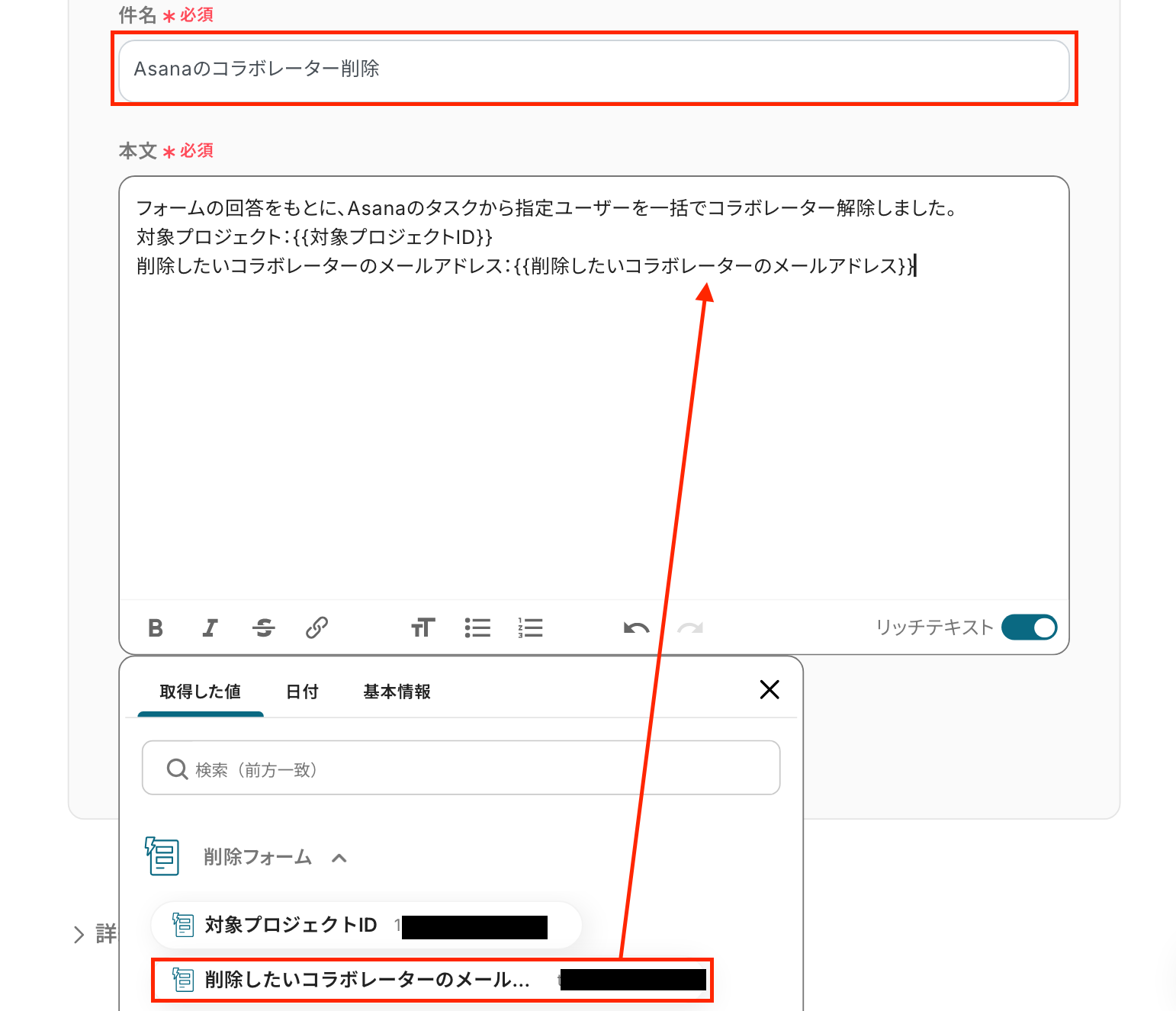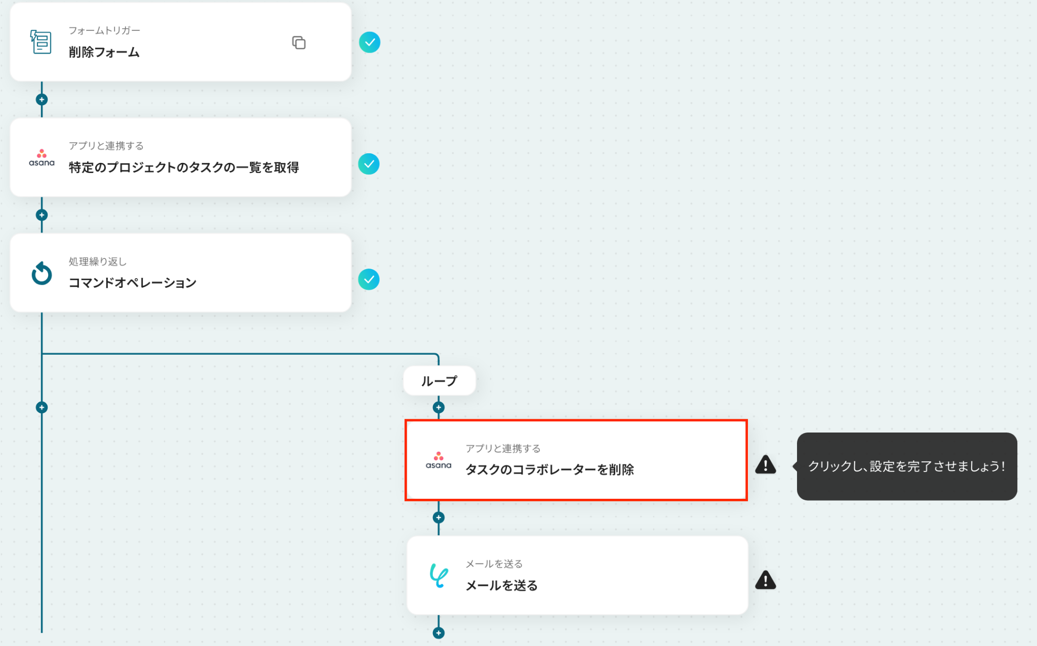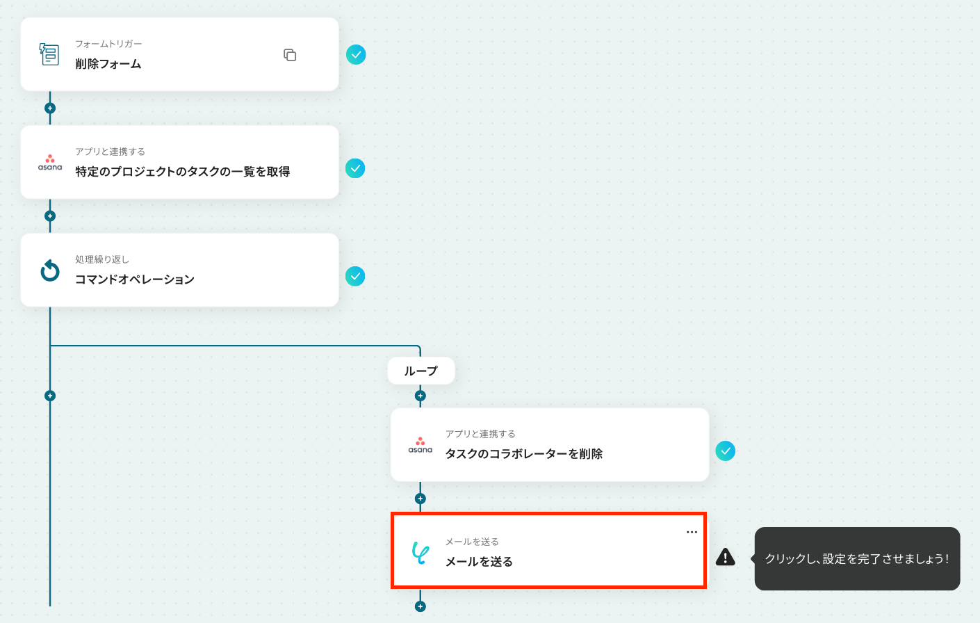 ここでは、Asanaのタスクから指定ユーザーを一括でコラボレーター解除したことを指定のメールアドレスに送信する設定を行います。