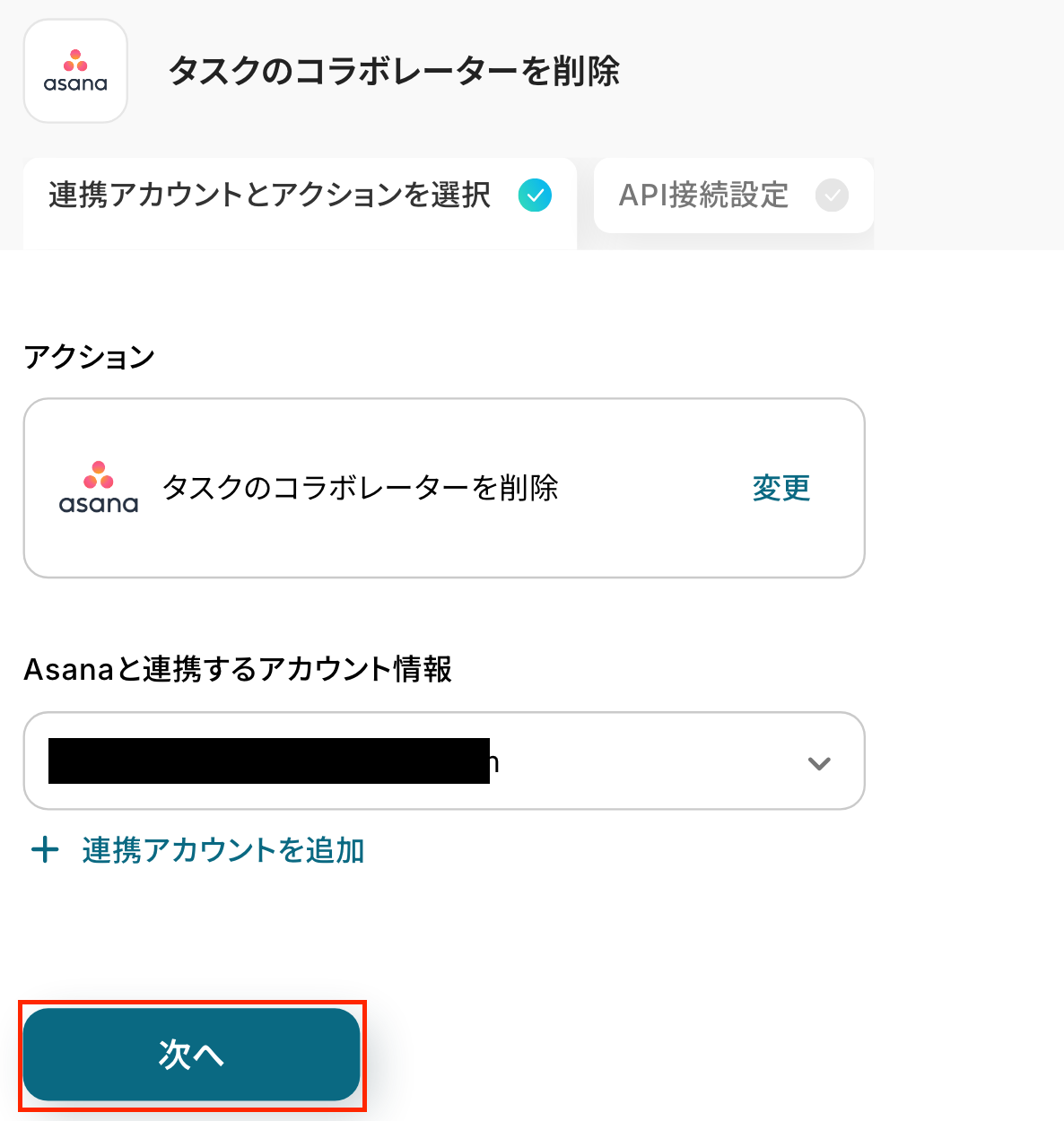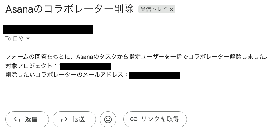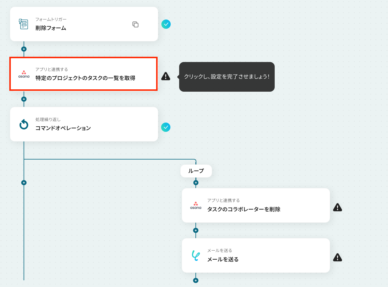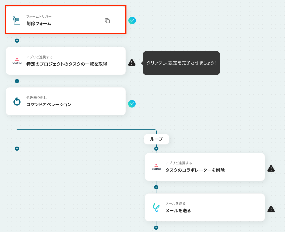 ここでは、Asanaのタスクから指定ユーザーを一括でコラボレーター解除したことを指定のメールアドレスに送信する設定を行います。