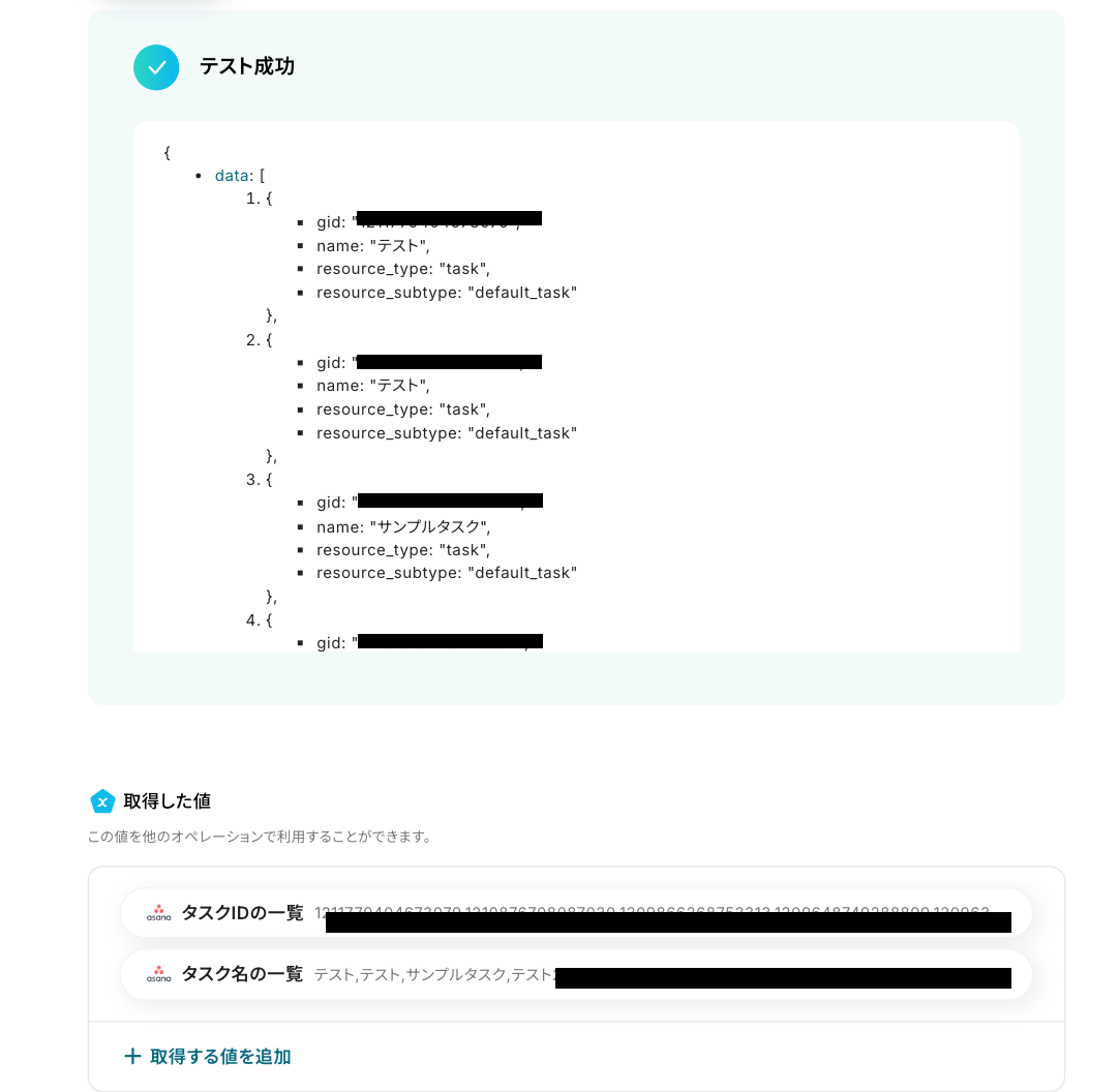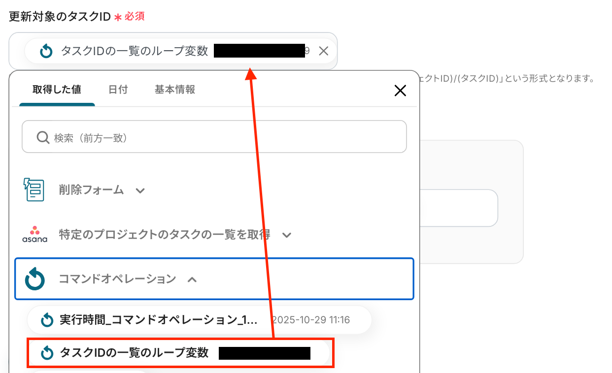 「取得した値」は、先ほどのステップで取得した「タスクIDの一覧」を設定しましょう!