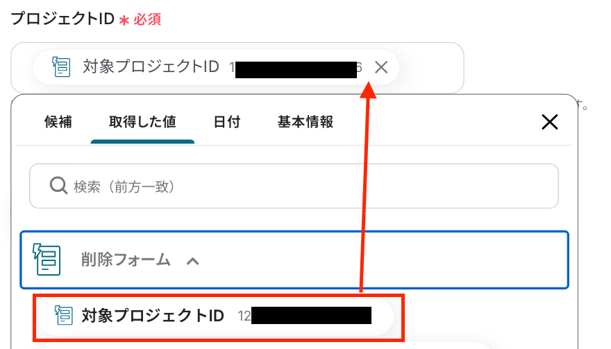 以下の画像のように入力欄をクリックすると先ほど取得した値が出てくるので該当するものをクリックしましょう。