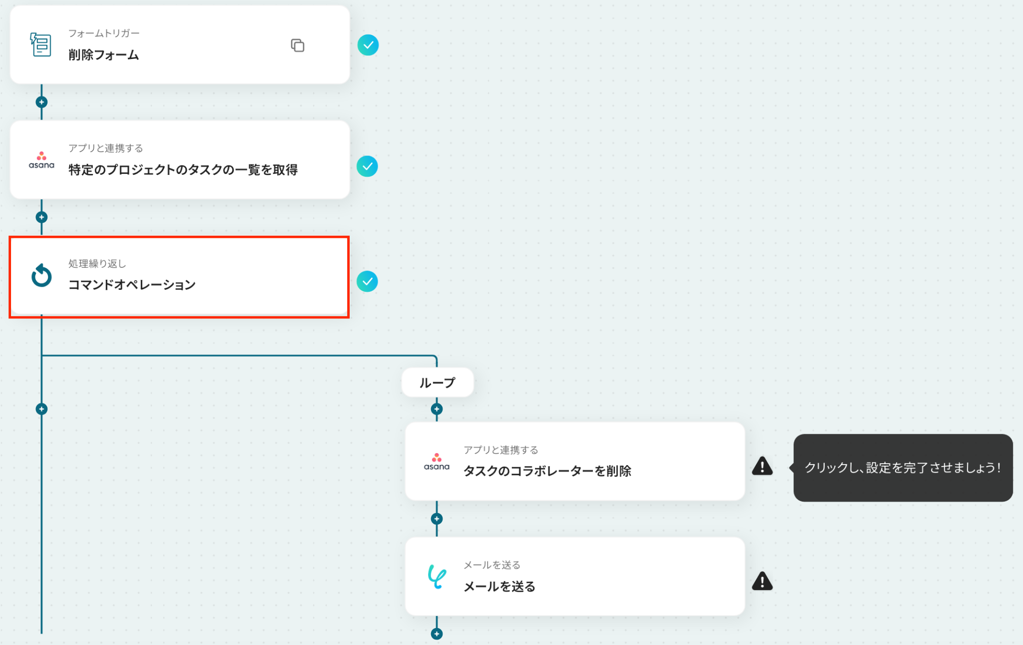 以上で、「フォーム回答をもとに、Asanaのプロジェクト内タスクから指定コラボレーターを一括削除する」フローの完成です。