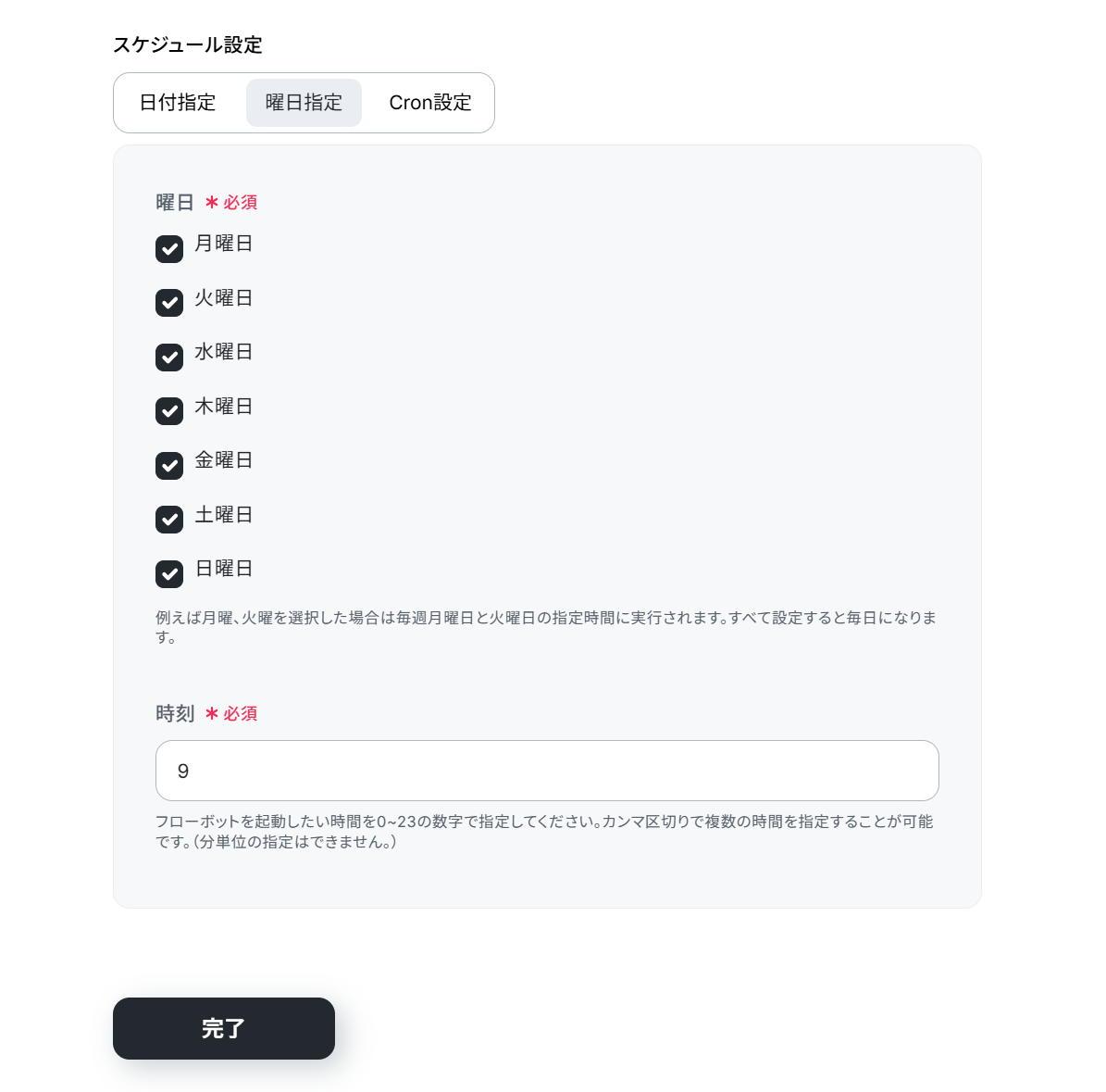 (2)スケジュール設定は日付指定、曜日指定、Cron設定と自由に起動タイミングを選択できます。