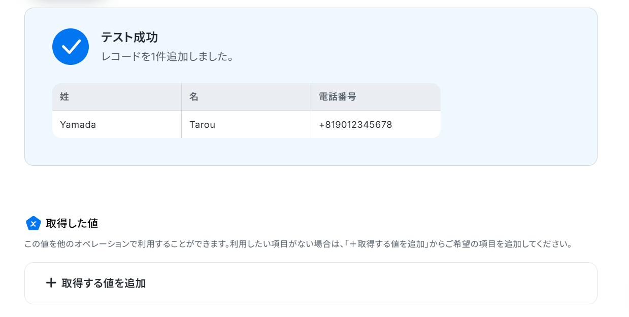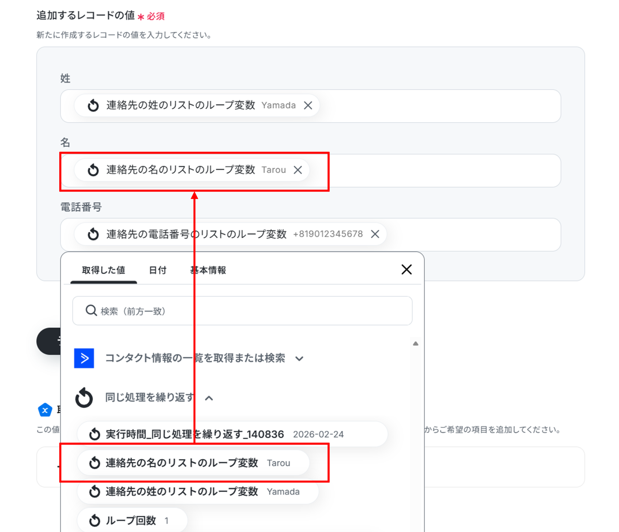 - 取得した値:「連絡先の名のリスト」などGoogle スプレッドシートに追加したい項目を選択