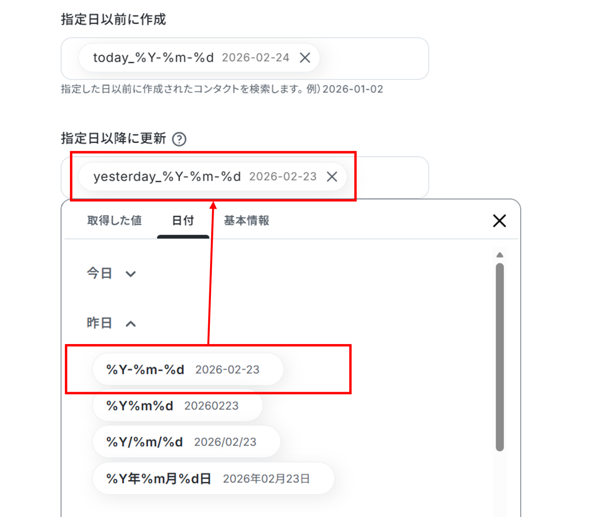 画像のように「指定日以前に作成」と「指定日以降に更新」に「日付」を使って入力します。